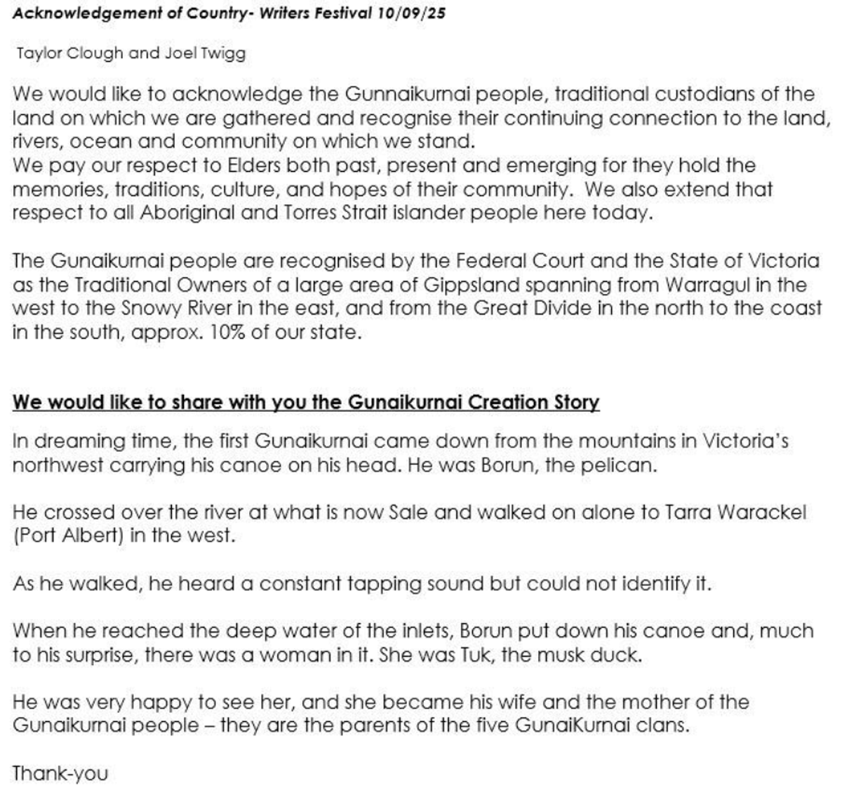 - Significant contributions to the Far East Gippsland School Network Writers Festival from all our year levels. The festival was opened with a wonderful Acknowledgement of Country from Taylor C and Joel T. I have included this at the end of my report.