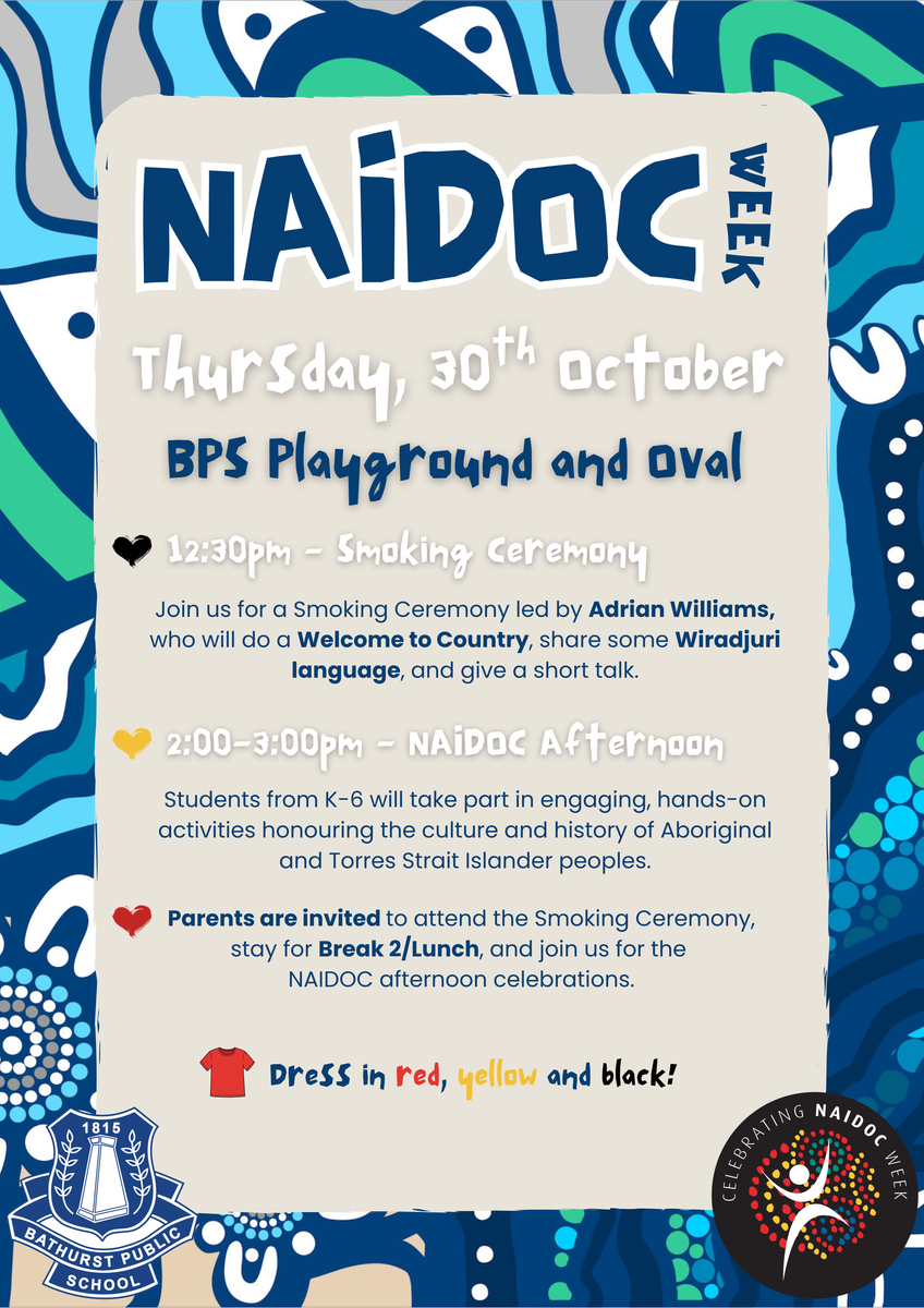 - On Thursday 30th October, children are asked to come to school dressed in red, black and yellow colours. We will participate in a smoking ceremony at 12.30pm and then have activities out of the classrooms from 2pm-3pm. All parents and friends are welcome to attend.