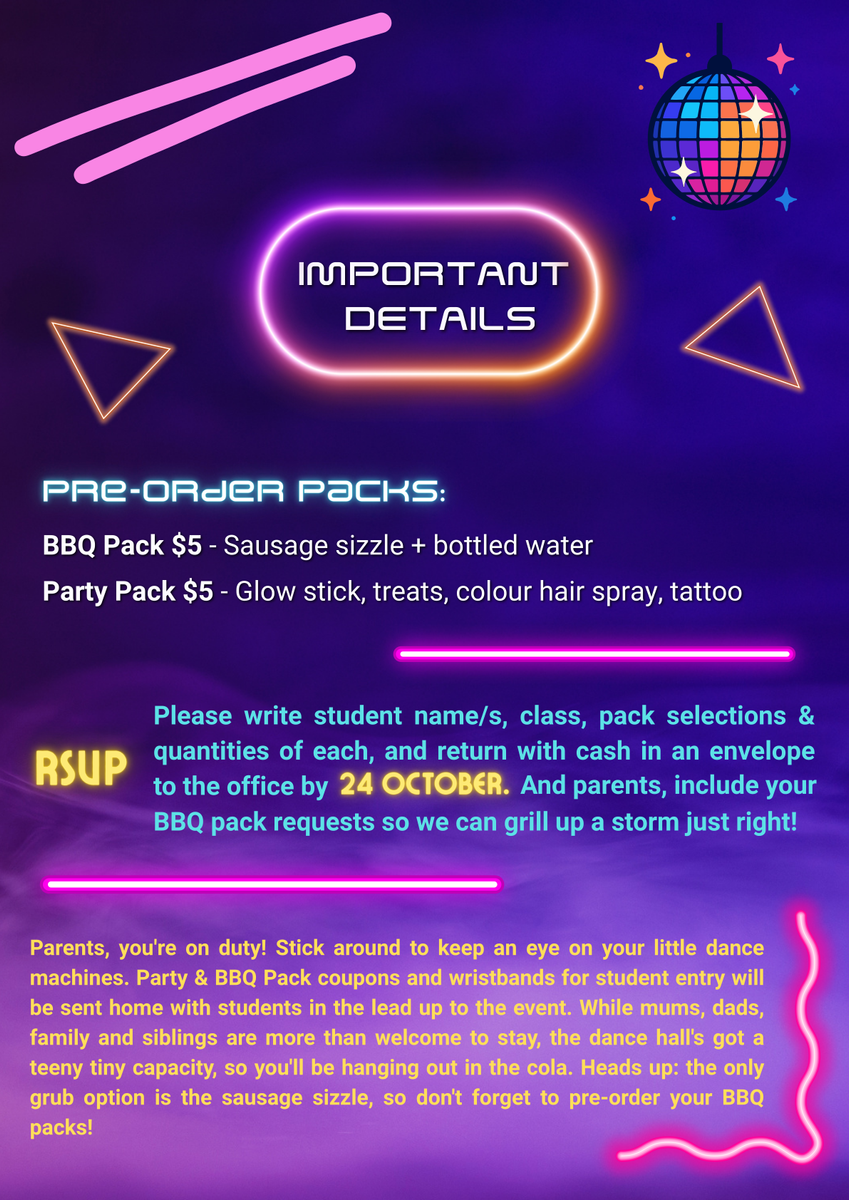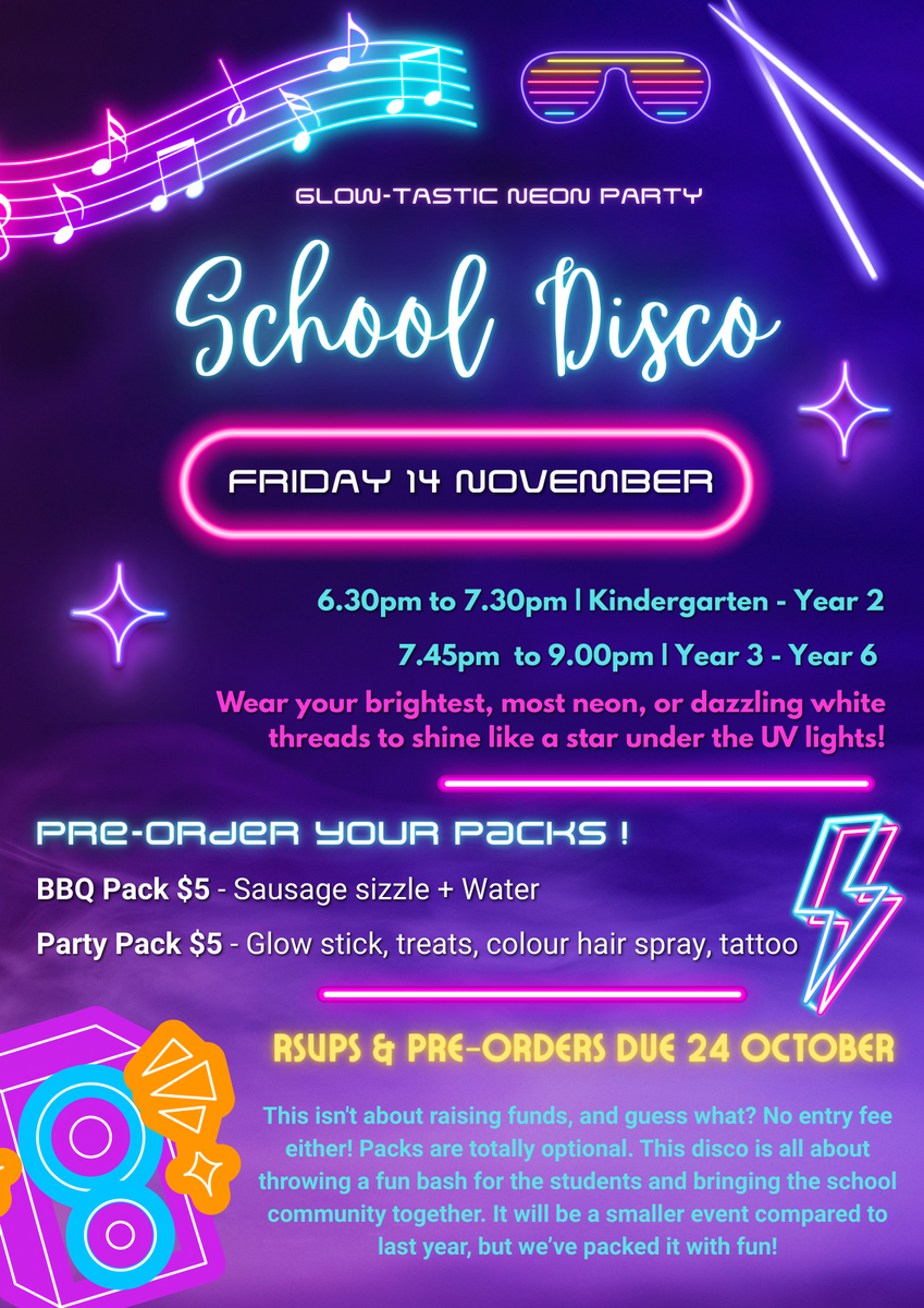 Our Parent Group have organised a disco for our students in Term 4, Friday 14 November.