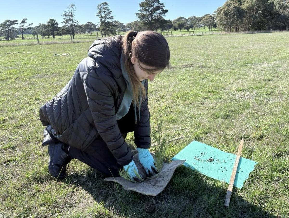 Saltbush’s regeneration of this site is being managed by the Merricks-Coolart Landcare Group, whose expert guidance ensures successful results from tree planting days. Members generously gave their time, setting up and educating attendees how to increase the chance of a tree surviving from a typical 20% to over 80%. One important step was to install mini ‘rabbit-proof fences’ around each tree, to prevent damage from rabbits and other animals.
