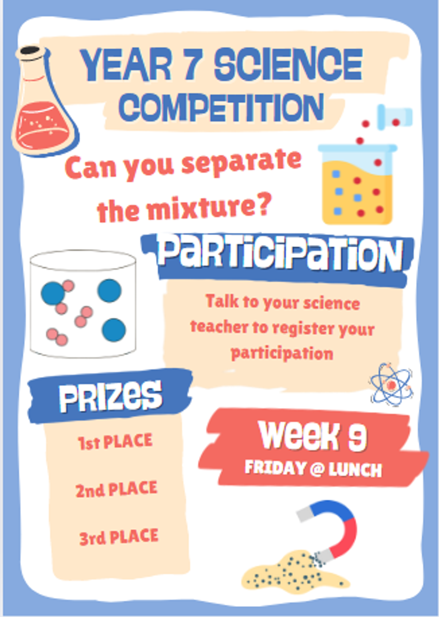 The science team will be hosting a competition for Year 7 students to put their learning into practice and separating a messy mixture into pure water!