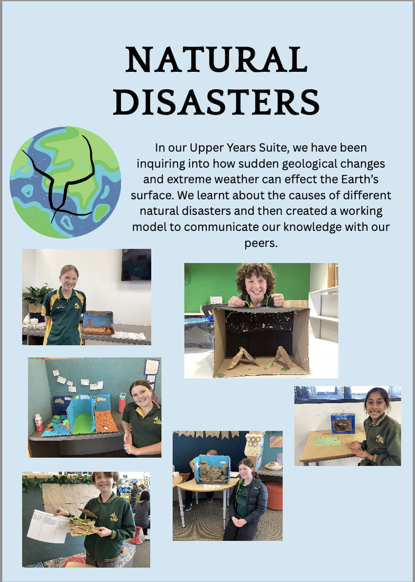 As part of their inquiry, students designed and built their own 3D working models such as volcanoes, landslides, tsunamis, drought, bushfires, and earthquakes, to demonstrate how these natural processes occur and the impact they can have. This hands-on approach encouraged curiosity, critical thinking, and collaboration, giving students the opportunity to learn in creative and memorable ways.