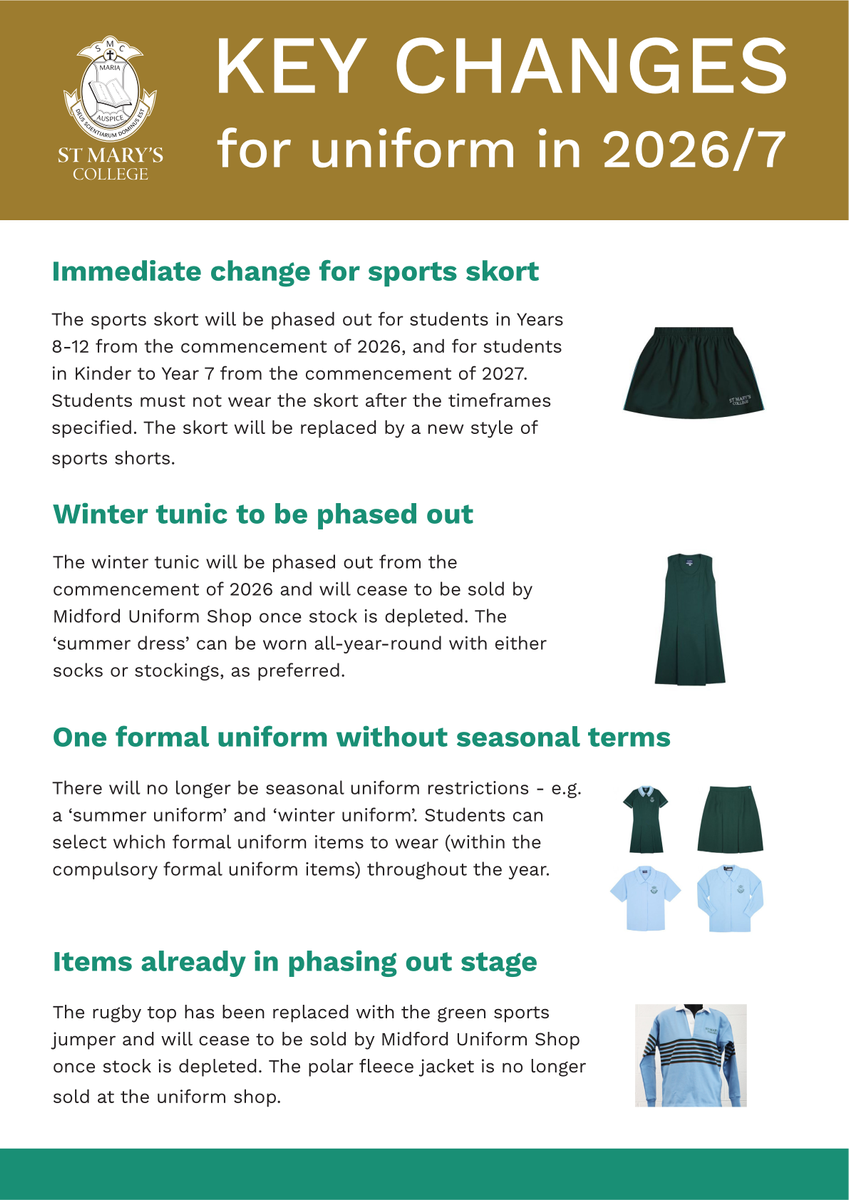 As we prepare for the year ahead, parents and carers are advised of the following uniform changes for 2026/7. Please refer to the visual guide below for further details.