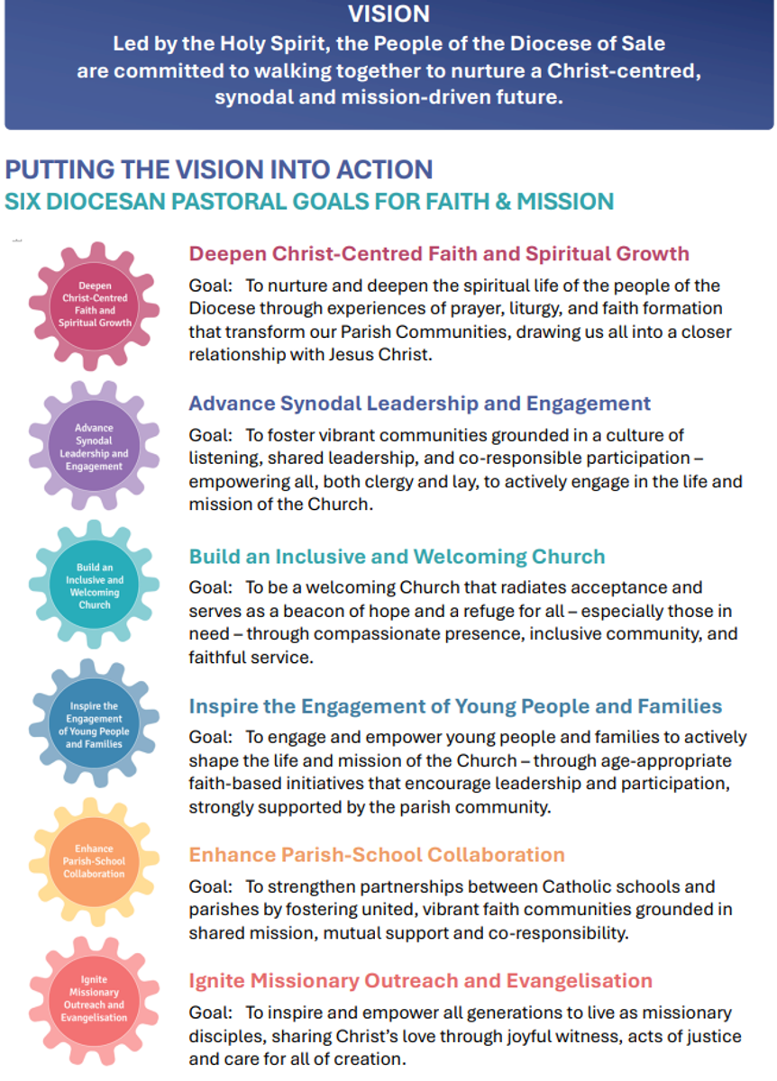 This plan is the product of a lengthy period of discernment and the fruit of Diocesan Assembly which was held earlier this year. The plan features 6 pastoral goals for faith and mission which will guide the vision and work in the Diocese, including here at St Peter’s, over the next 5 years.