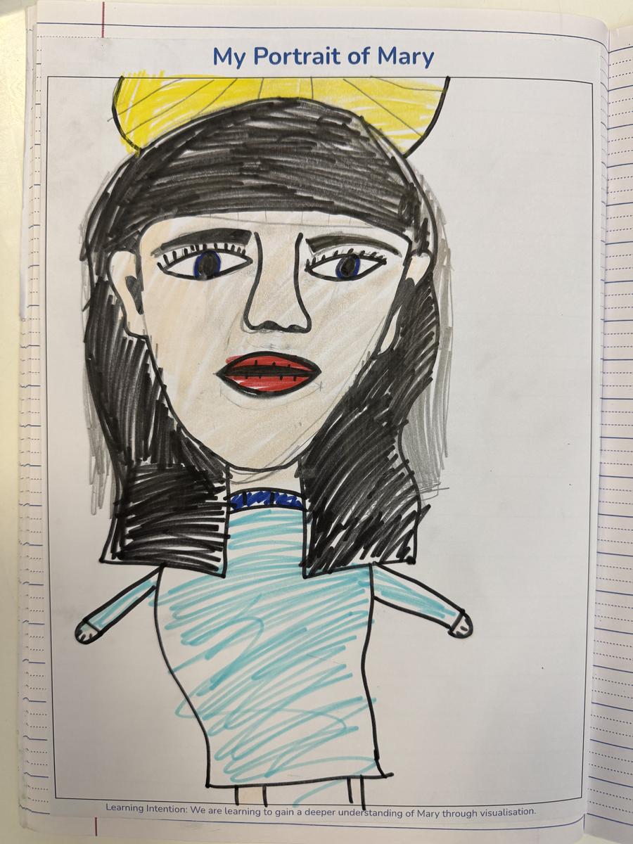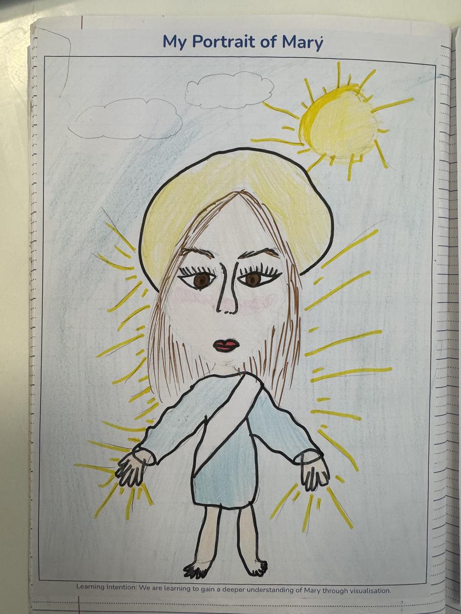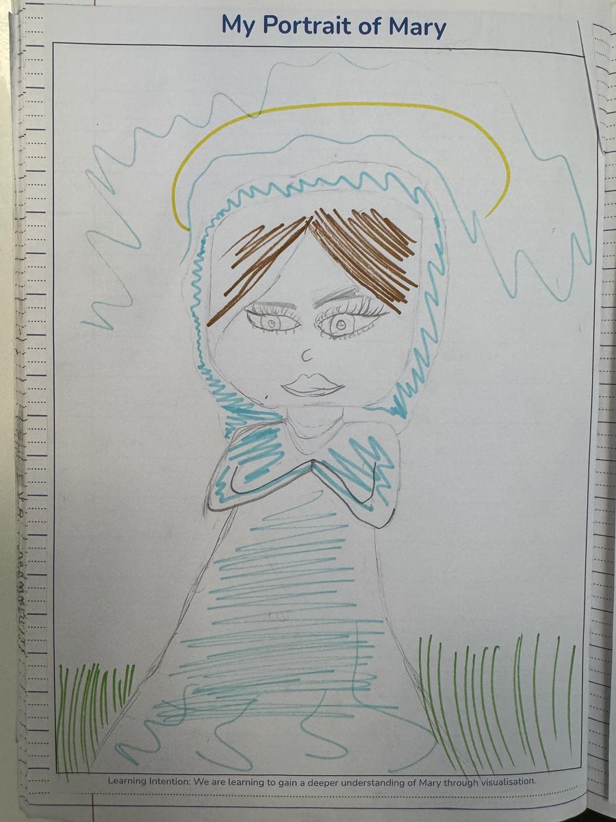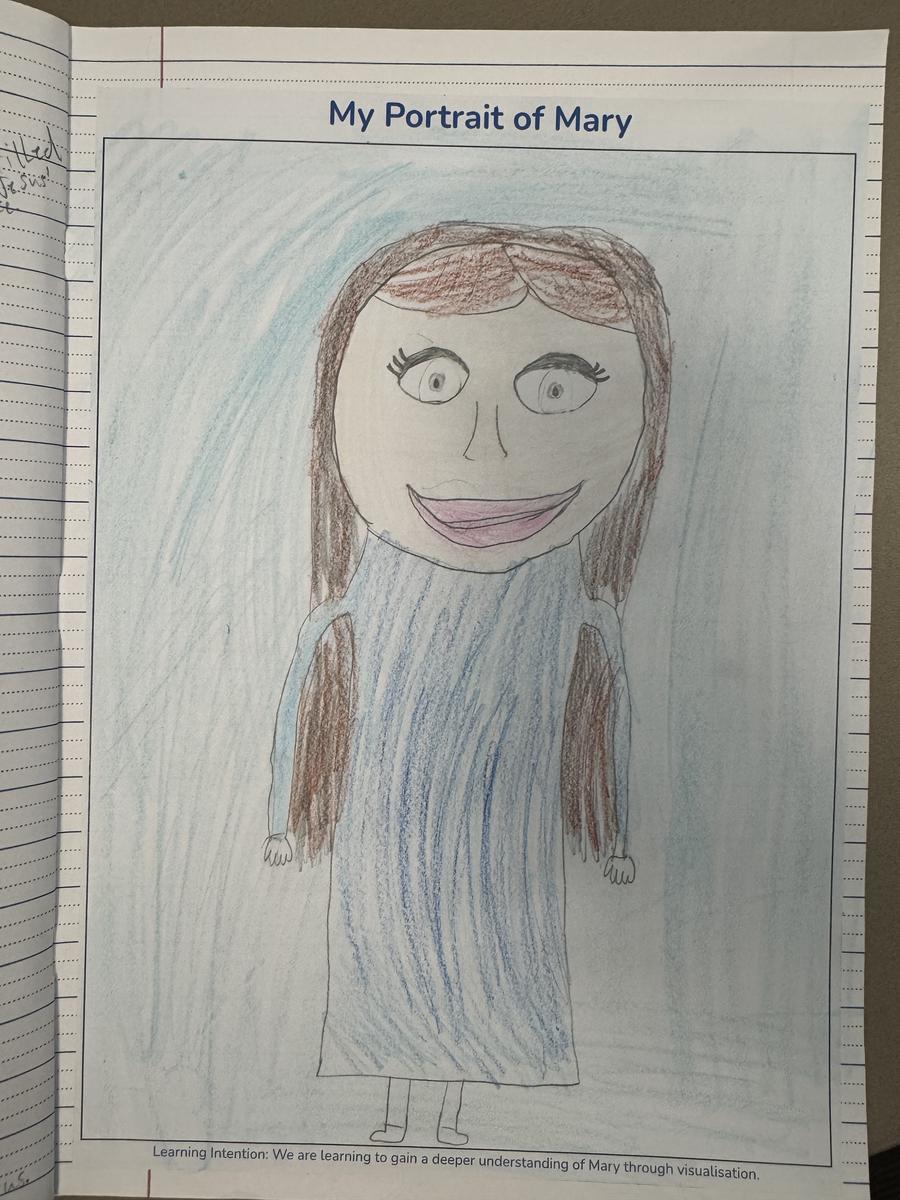 As members of a Catholic community, we are learning about the importance of Mother Mary in the Catholic church. We created our own visualisations of Mother Mary based on our prior knowledge. We have looked at the Hail Mary prayer, and unpacked the phrases to gain a deeper understanding of why we pray to Mary.