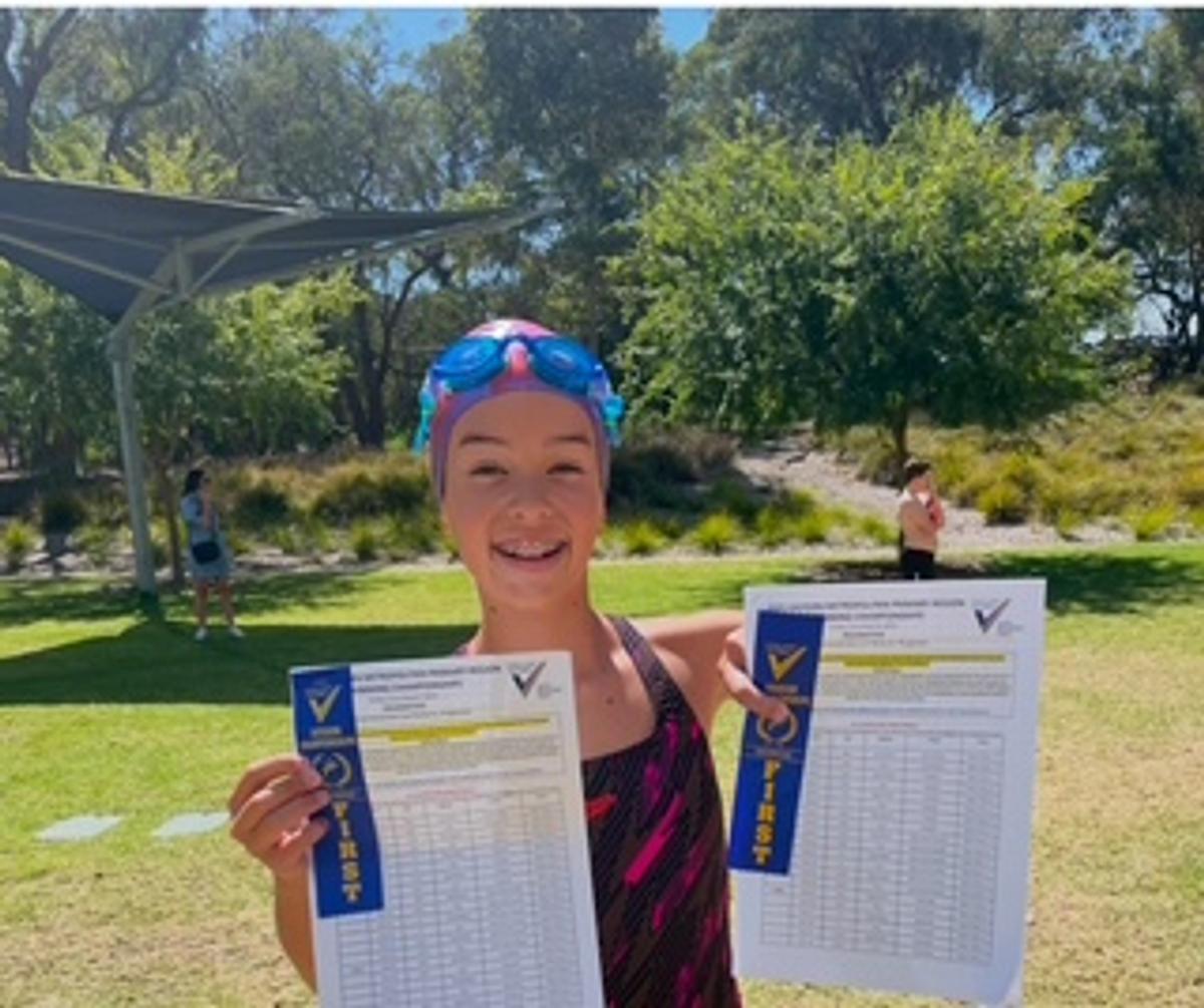 Islie with her first place ribbons for individual freestyle and backstroke at District.