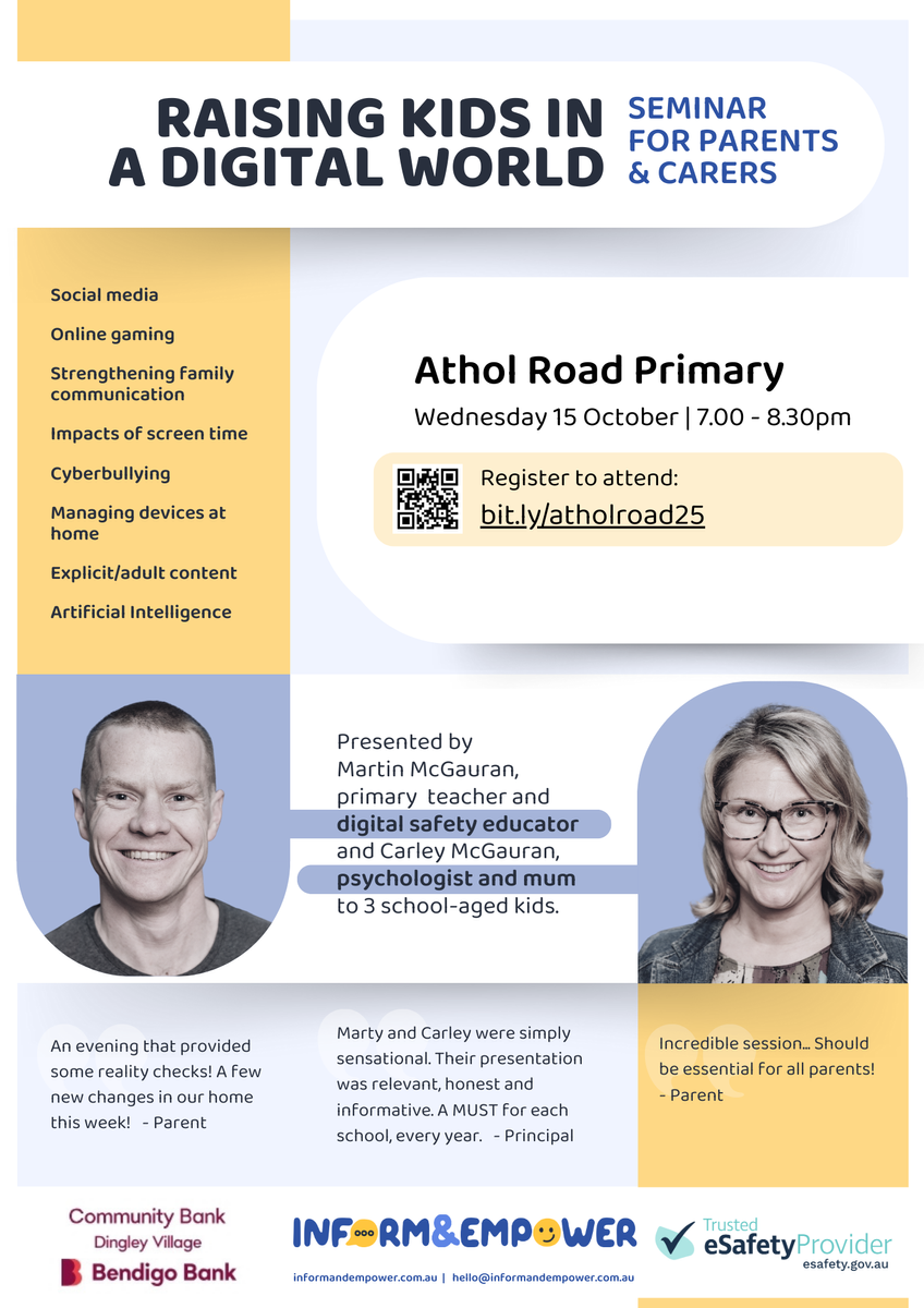 At Athol Road Primary School, we are committed to helping our students develop the knowledge and skills they need to safely and confidently navigate the online world. Thanks to the generous support of the Bendigo Bank in Dingley, we are proud to be running the Inform and Empower program across our school.