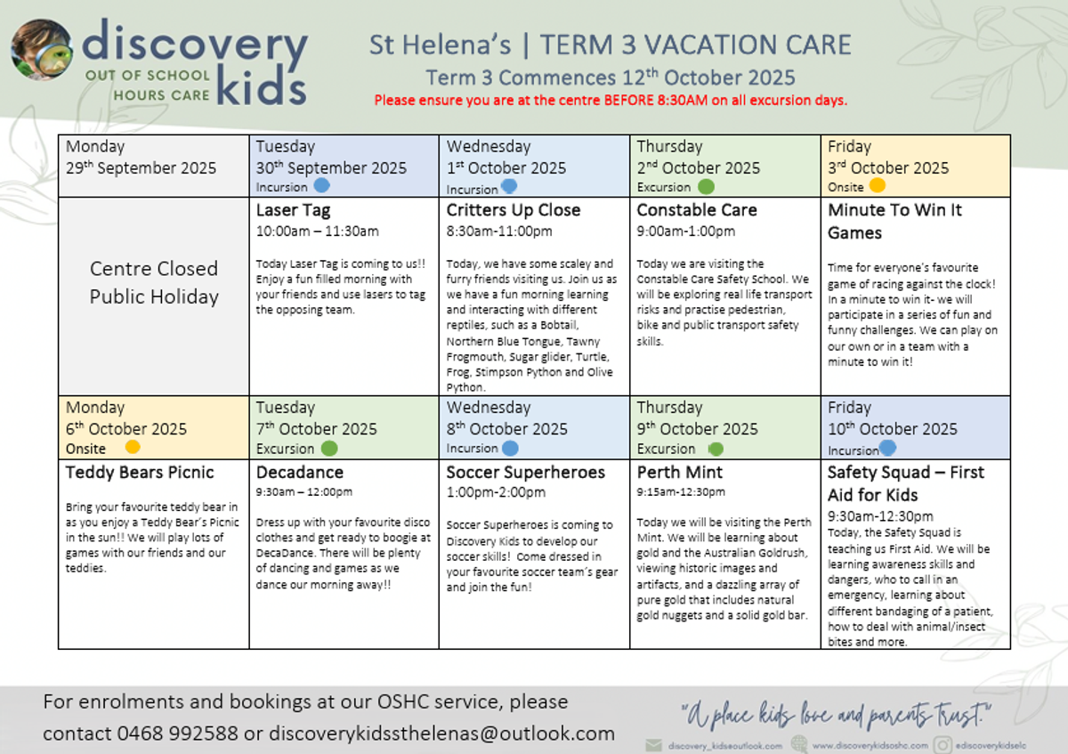 For enrolments and bookings please use My Family Lounge or contact them at discovery_kids@outlook.com