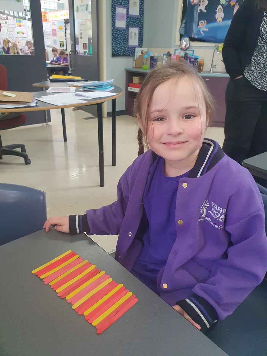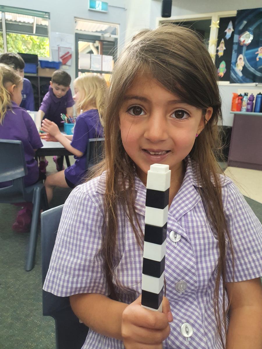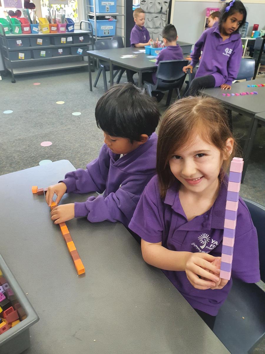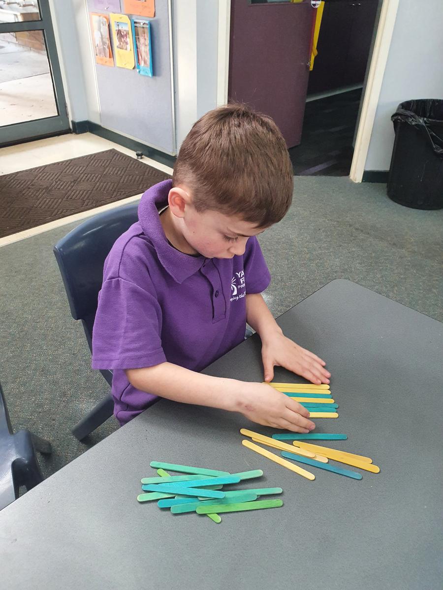 In Maths, we have been learning about different types of patterns, such as shape patterns, colour patterns, number patterns, and repeating patterns, with 2 and 3 elements. Our students completed a number of rotations using unfix cubes, icy pole sticks, buttons, and pattern blocks to create and continue different patterns. During Applied Maths on a Wednesday, students learned about capacity and how much something can hold. We used water and food dye to compare the capacity of different shaped containers, to make predictions, and compare and record our answers. We introduced the students to the language of full, empty, half, nearly full and nearly empty.