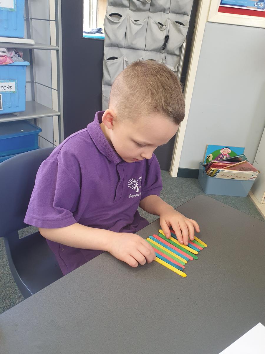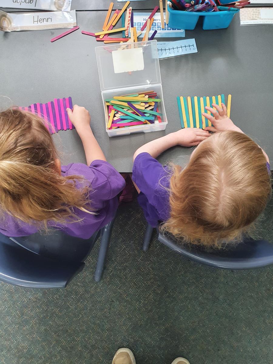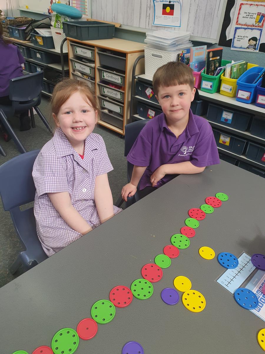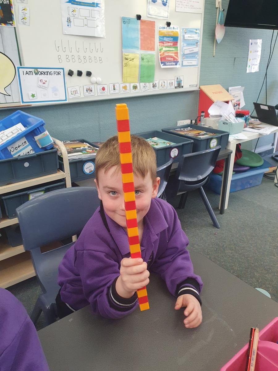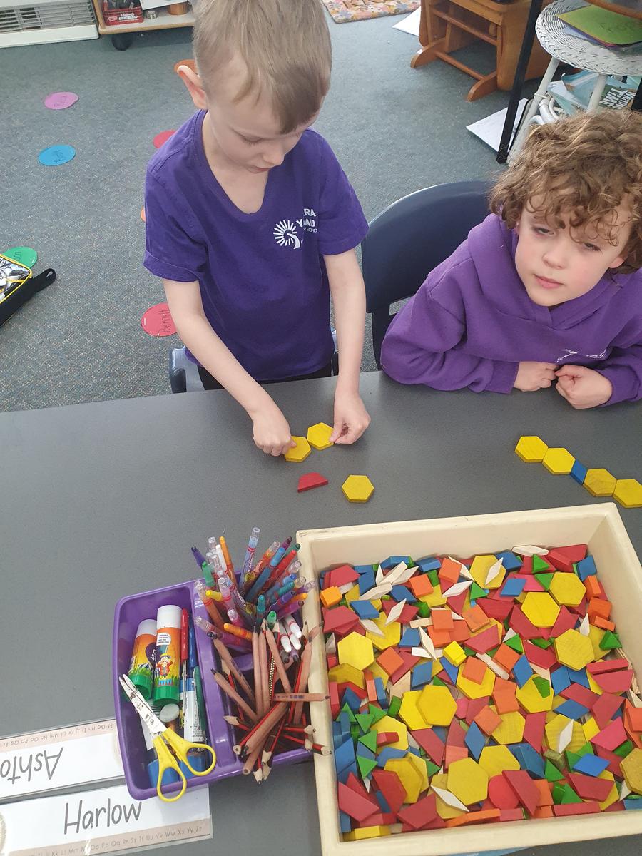 In Maths, we have been learning about different types of patterns, such as shape patterns, colour patterns, number patterns, and repeating patterns, with 2 and 3 elements. Our students completed a number of rotations using unfix cubes, icy pole sticks, buttons, and pattern blocks to create and continue different patterns. During Applied Maths on a Wednesday, students learned about capacity and how much something can hold. We used water and food dye to compare the capacity of different shaped containers, to make predictions, and compare and record our answers. We introduced the students to the language of full, empty, half, nearly full and nearly empty.