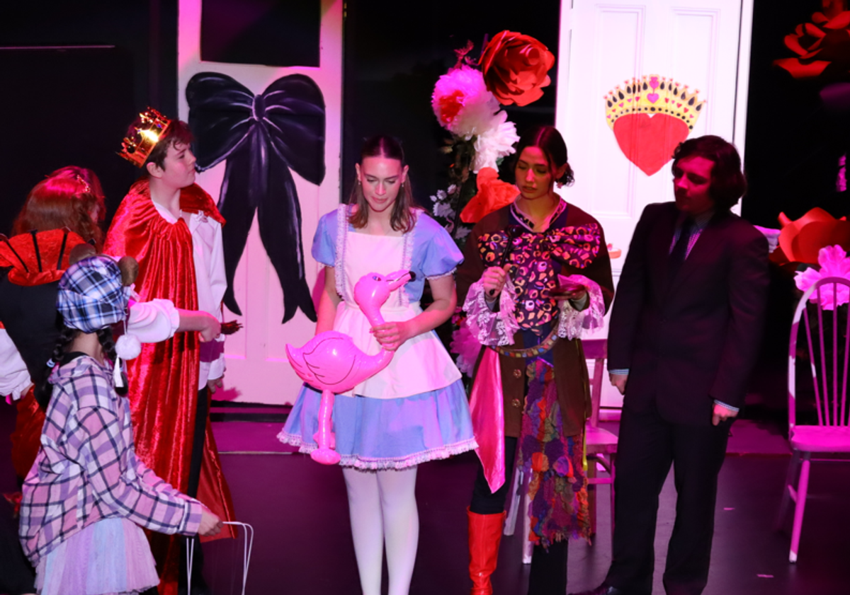 Behind the scenes, the technical and backstage teams were equally vital. Patrick Rees operated lights, while Makinley Perry and Brandon Pearce managed sound, supported by an incredible backstage crew. The show was guided by dedicated staff, including Christine McFarlane as Musical Director, Millie Whitelaw in her debut as Choreographer, Leigh Holland as Set Builder, and Melissa McCallum, whose set design brought the world of Wonderland to vivid life. The Arts team also transformed the PAC with stunning décor that immersed audiences in the story.