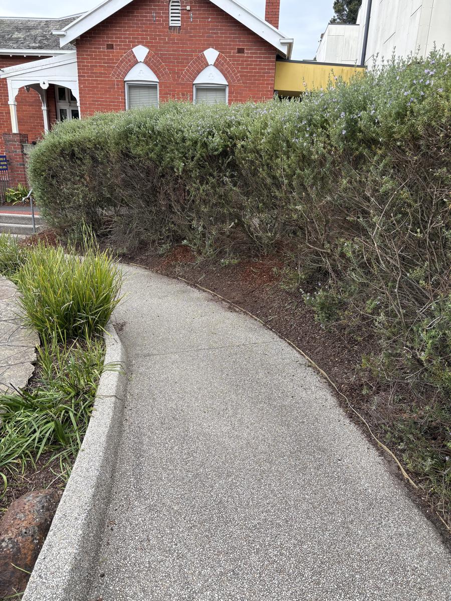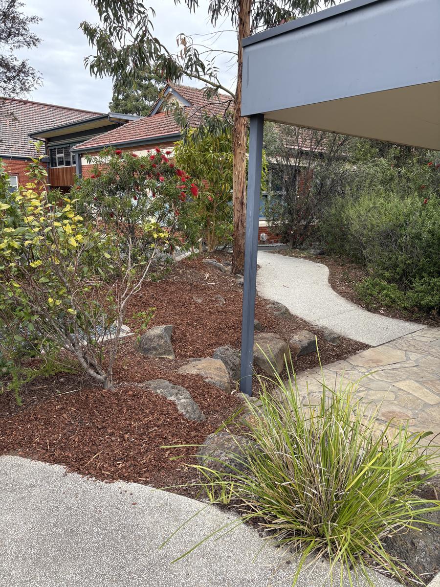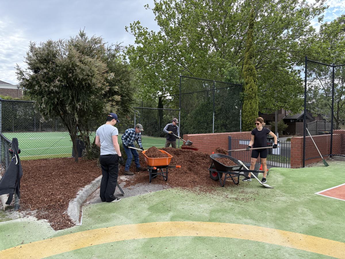 During the morning we completed a huge variety of tasks including, but not limited to: trimming high bushes along York St adjacent to the top playing courts; weeding the Orchard Garden along York St side of the property; weeding garden beds near hall stairs; preparing the grounds near the sport shed where our students' new aboriginal rock pathway installation will be laid; clearing ivy and the spouting above the Sport Shed; distributing mulch on garden beds; and blowing the school grounds.