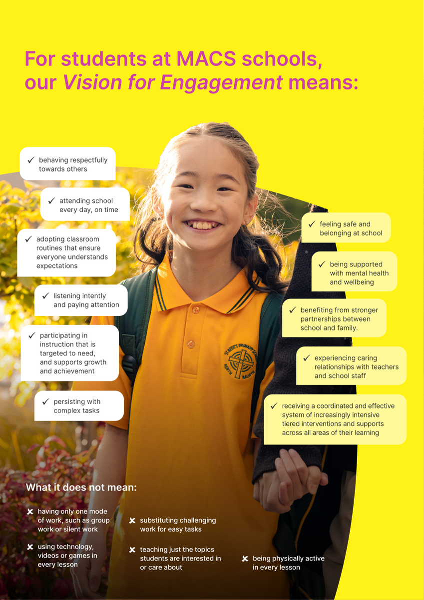 Vision for Engagement is a commitment from MACS schools to work in partnership with students and their families to successfully navigate the issues of contemporary life. Based on evidence of how students learn and thrive, it articulates six engagement practices and two implementation strategies that, when attended to in a consistent and sustained manner, create enabling learning environments and support young people to be learners. It affirms current practices across MACS schools with a clear articulation of our expectations and solidifies the importance of engagement as a learning improvement strategy.