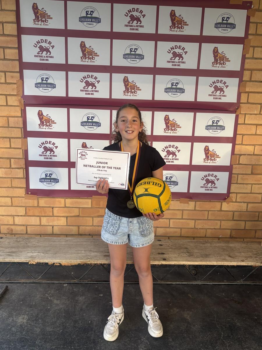 At Undera Football Netball Clubs recent presentation evening, Ivy Valentin (5 JC), was awarded Junior Netballer of the Year for U11-U13 year levels.