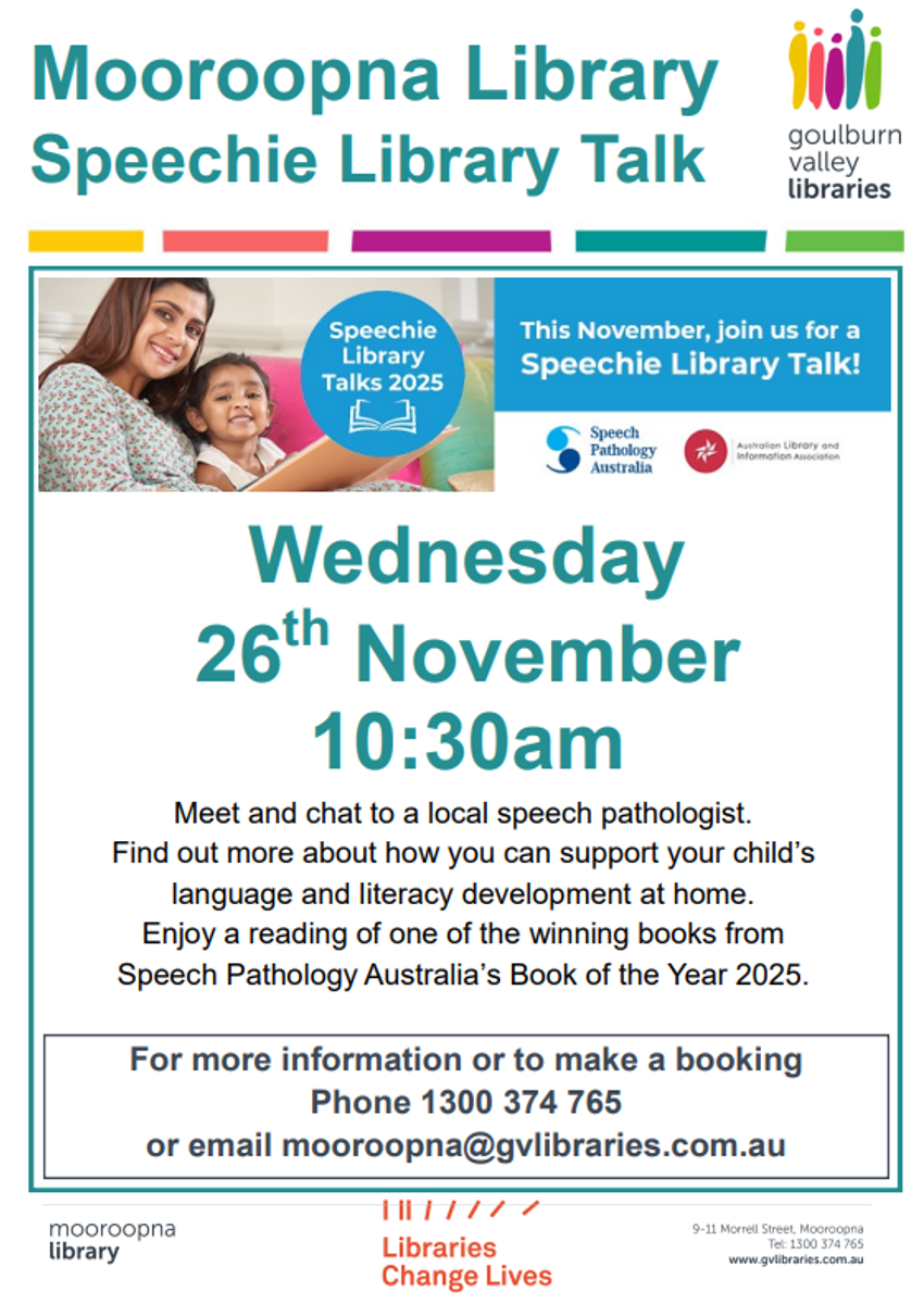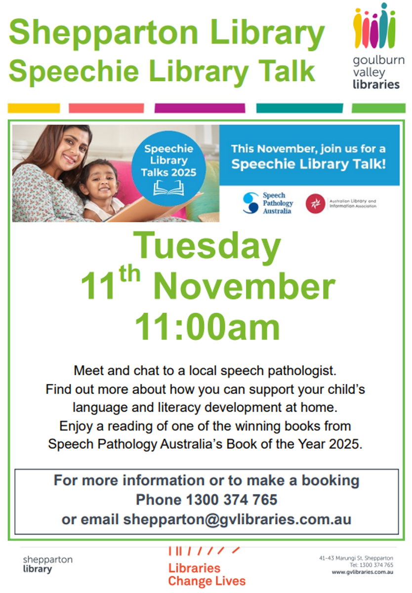 Goulburn Valley Libraries are delighted to be hosting four Speechie Library Talks this November. Please find attached some posters and additional information.