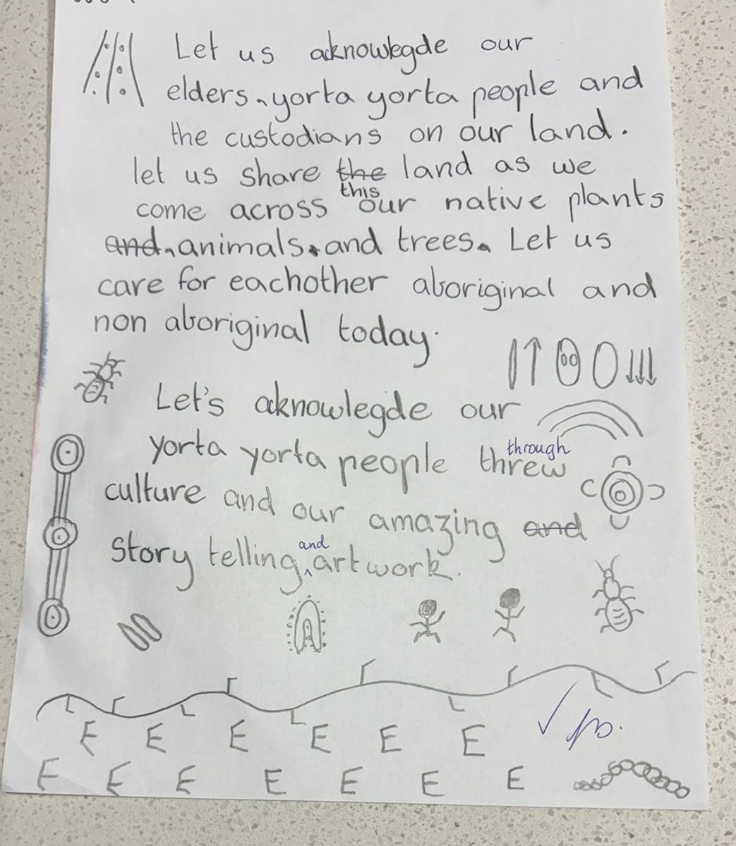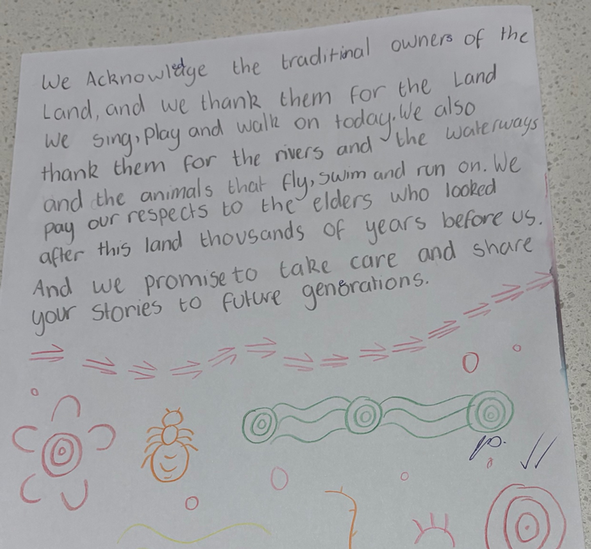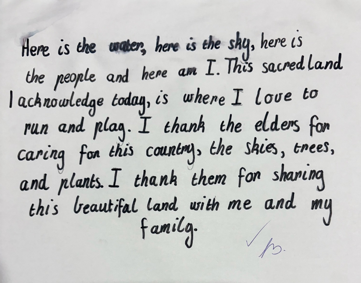 The Year 6s have learnt that an Acknowledgement of Country is an opportunity for anyone to show respect for Traditional Owners and the continuing connection of Aboriginal and Torres Strait Islander peoples to Country. An Acknowledgement of Country can be offered by any person and like a Welcome to Country, is given at the beginning of a meeting, speech or event. There is no specific wording for an Acknowledgement of Country, it just needs to be sincere and reflect the Country you are acknowledging.