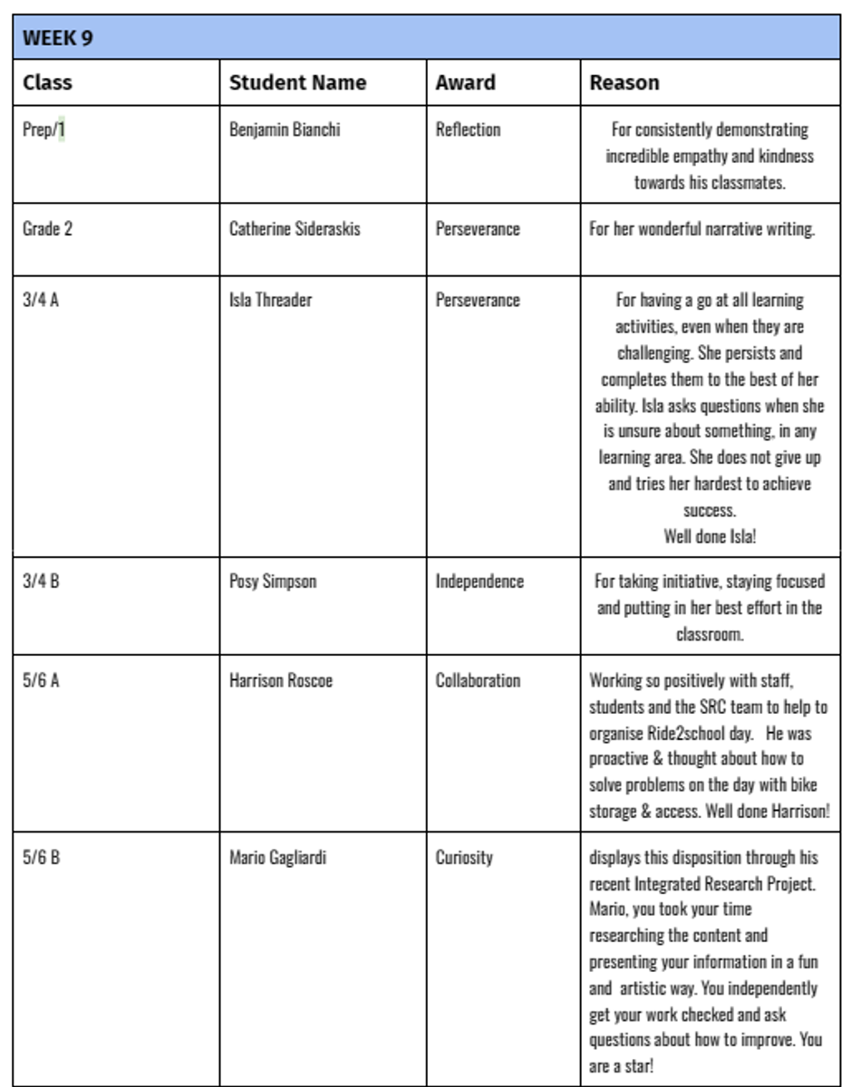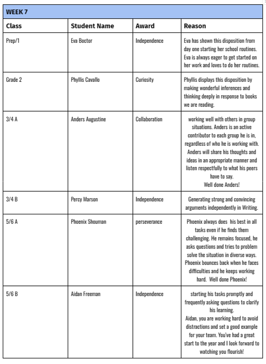 CONGRATULATIONS TO THE FOLLOWING STUDENTS WHO RECEIVED A CLASS AWARD THIS TERM...