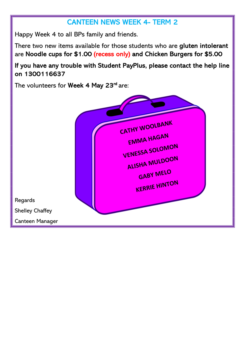 Sentral Pay Plus- If any parents are experiencing any issues with placing orders, technical issues for Canteen orders please contact Sentral Pay Plus directly on 1300 11 66 37
