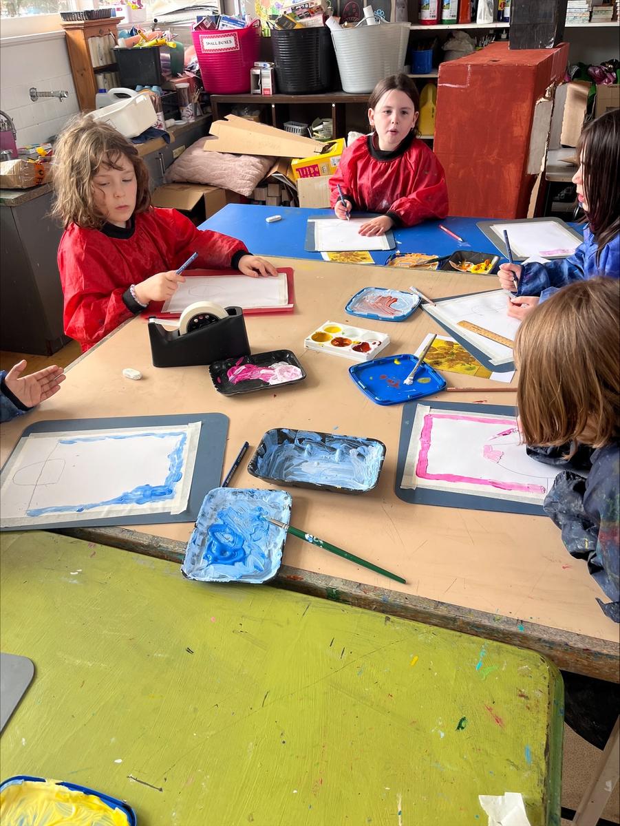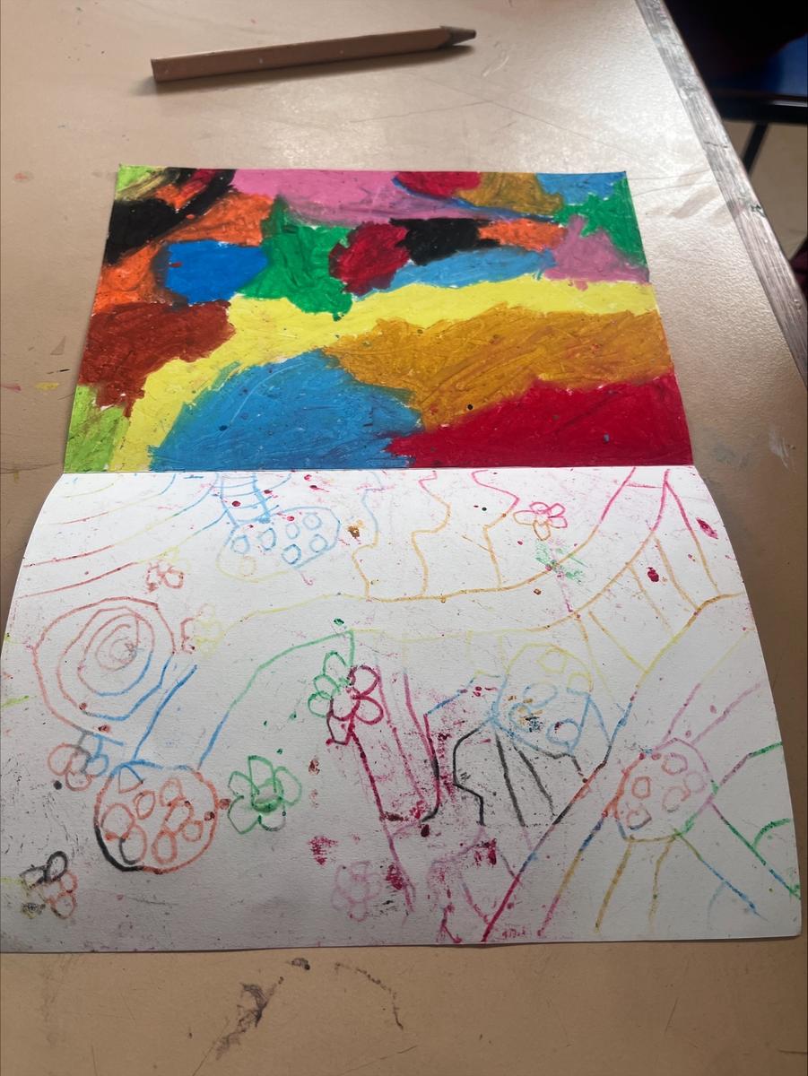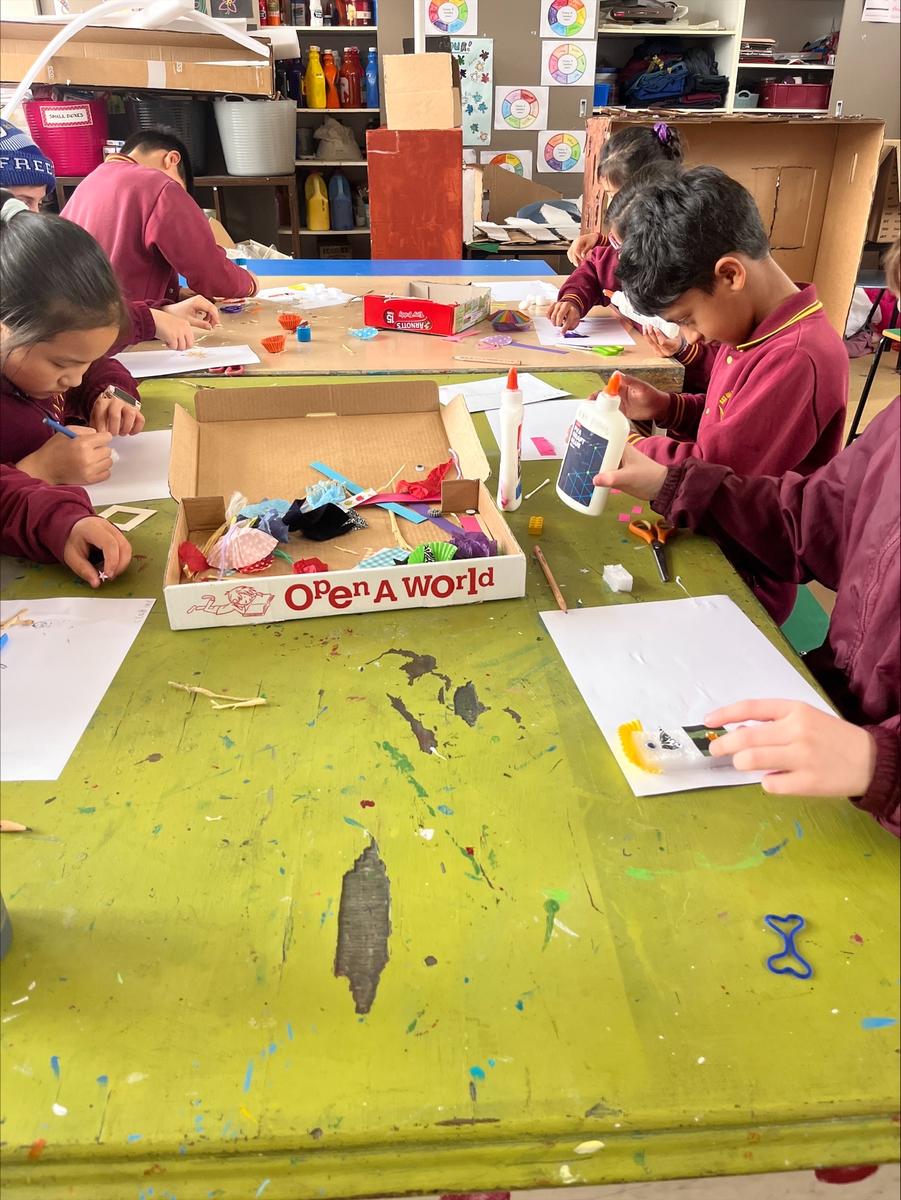 This term, Years 3 and 4 artists discovered the excitement of monoprinting. They created a series of prints using watercolour, paint, and oil pastel, learning that each result is unique. For their oil pastel monoprints, they drew inspiration from the work of Yayoi Kusama, exploring bold patterns, dots, and vibrant colours. To finish the term, they also took on the “Mystery Box Challenge,” transforming unexpected items into imaginative artworks. This encouraged problem-solving, risk-taking, and plenty of creative fun!