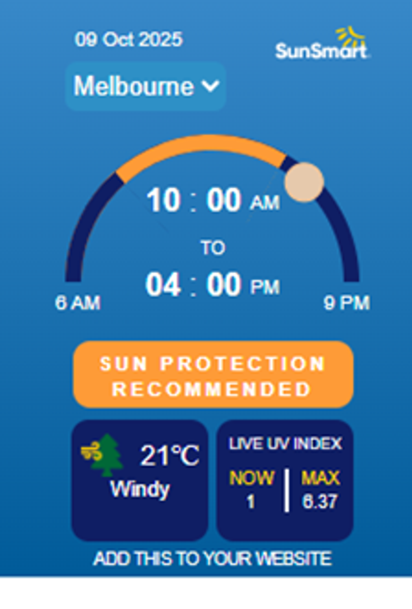 can be damaging to our skin without us knowing. The UV rating is usually 3 from 10, then rises to as high as 6 or 7, then can be at 3 until 4.30 in the afternoon. The UV rating is not related to the sun shining or not. Even on overcast days the UV rating can reach levels that can cause problems. This week’s highest average was 5, with 7 expected next week. The Sun Smart widget that shows the expected levels for the day is available on our school website at the bottom of the home page.