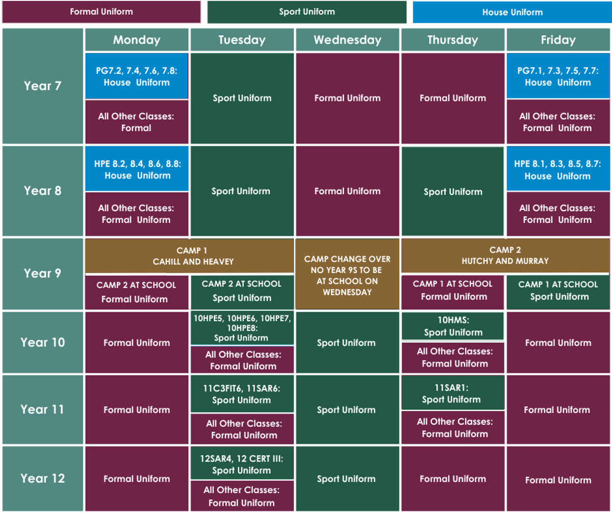 Following an alternative timetable, students will be at school when not at camp. They are required to wear their sport uniform on Tuesday and Friday.
