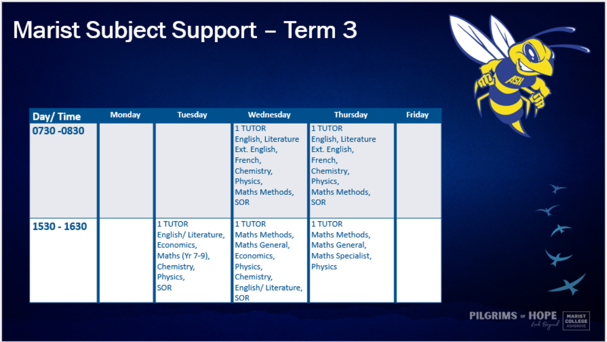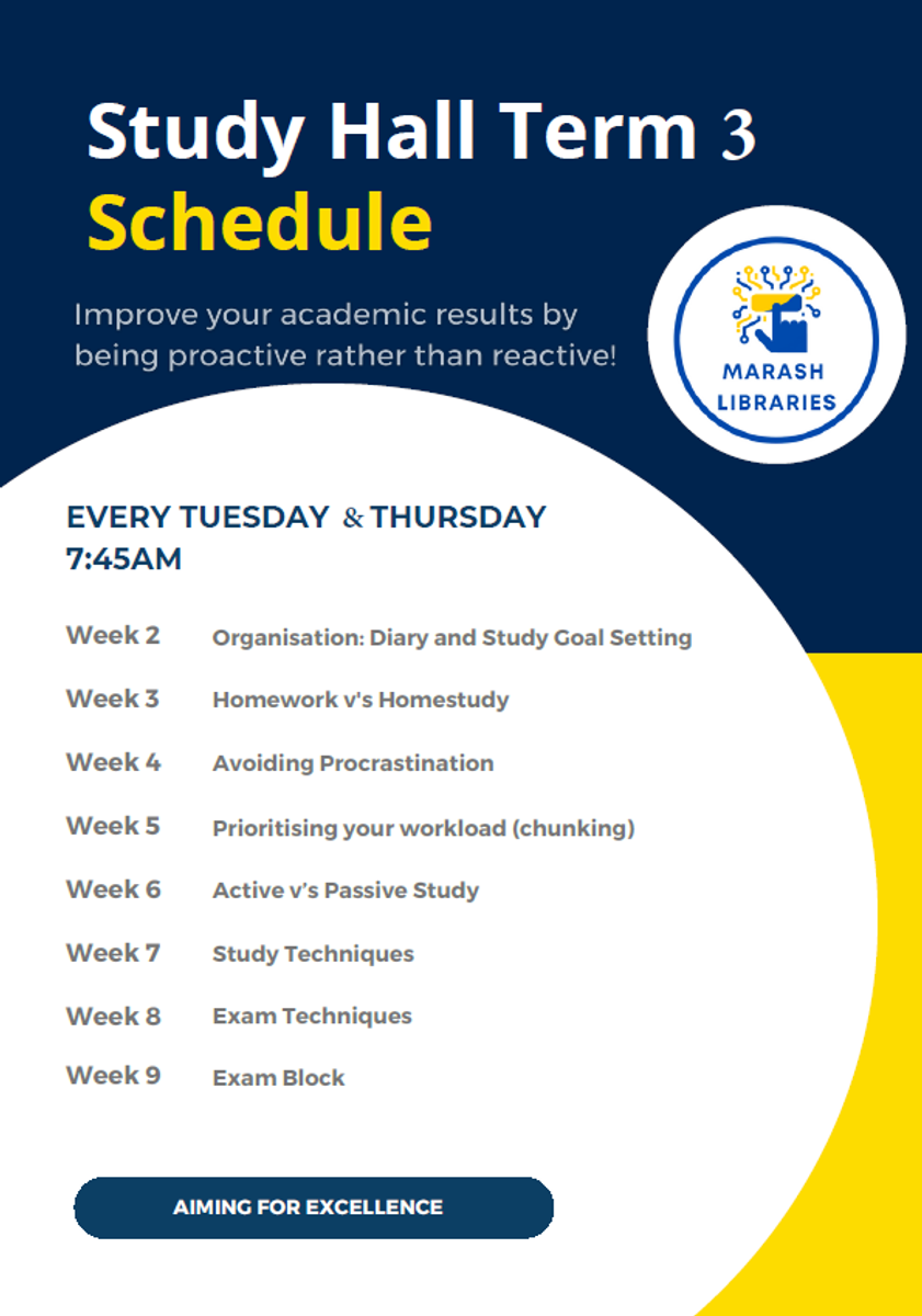 Year 12 Night Study Session will commence again this week - Wednesday night between 5pm and 8pm. Mini-masterclasses in External exam preparation are also being offered at the following times: