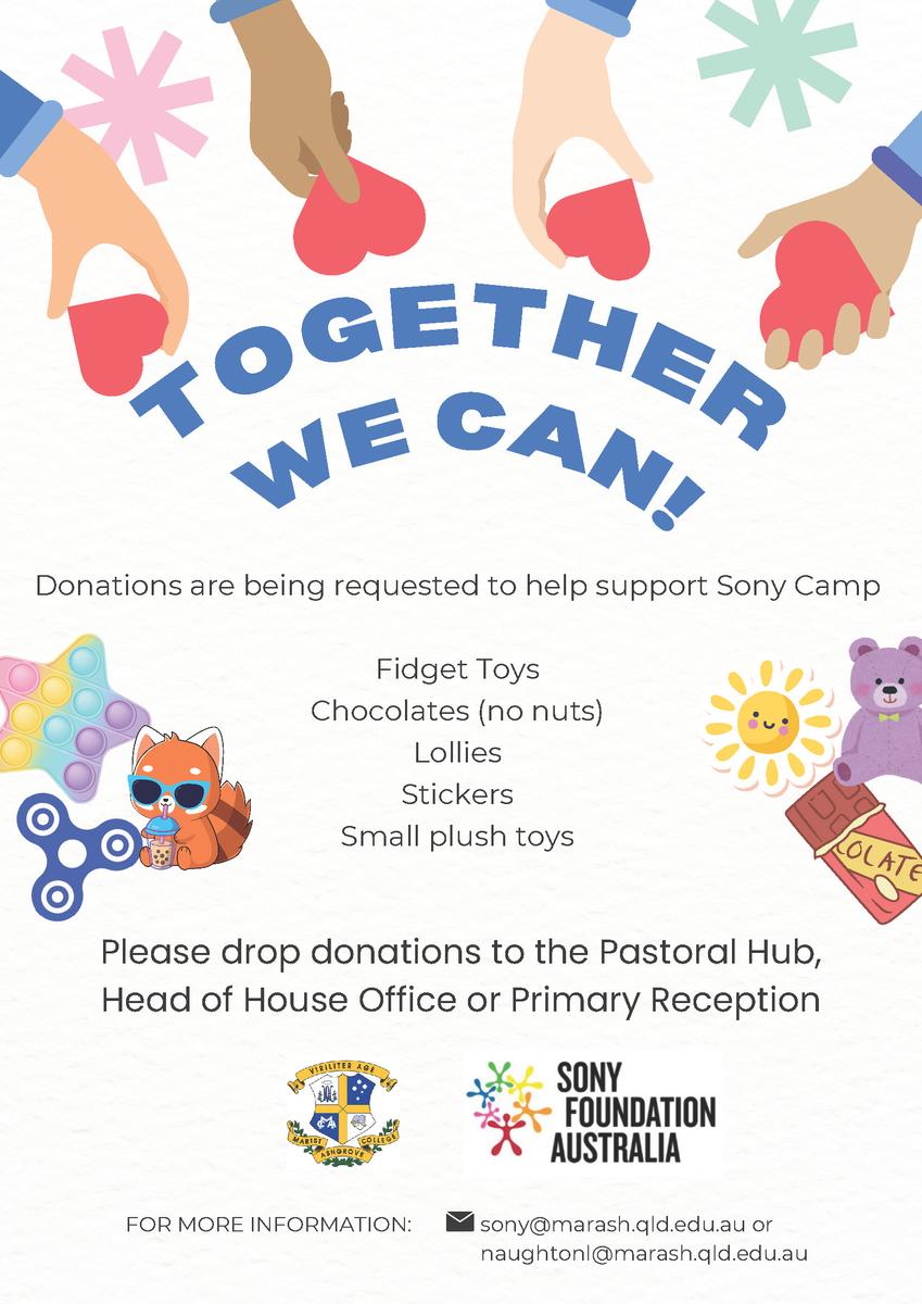 This September school holidays, Marist College and Mt Alvernia College are once again hosting the Sony Foundation Camp - a weekend of fun, friendship and respite for young people with disabilities and their families. To make the experience extra special, we invite our community to donate small, joy-filled items such as fidget toys, nut-free chocolates, lollies, plush toys and stickers. Your generosity will help create lasting memories and bring countless smiles to the campers’ faces.