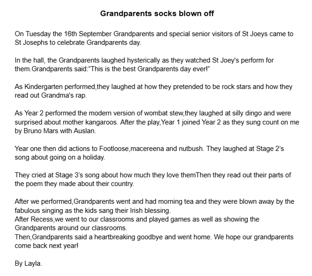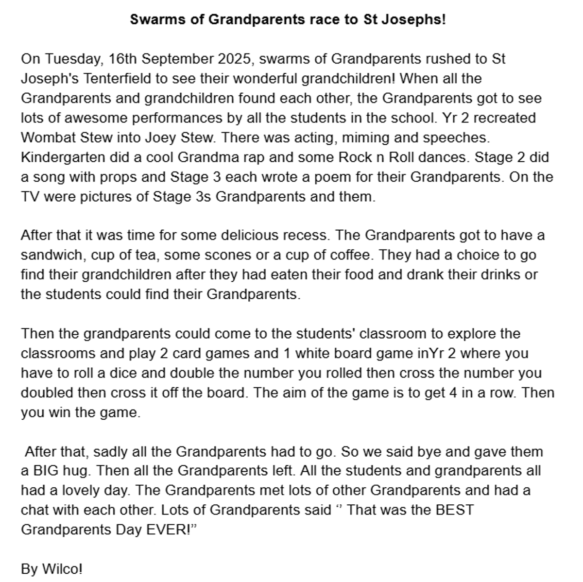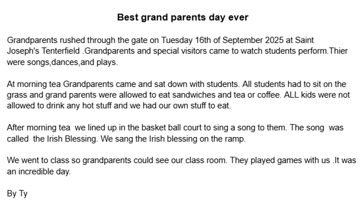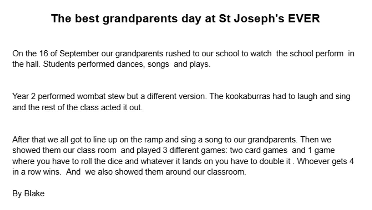 Students in Year 2 have composed news articles to report on our lovely Grandparent's Day last week.