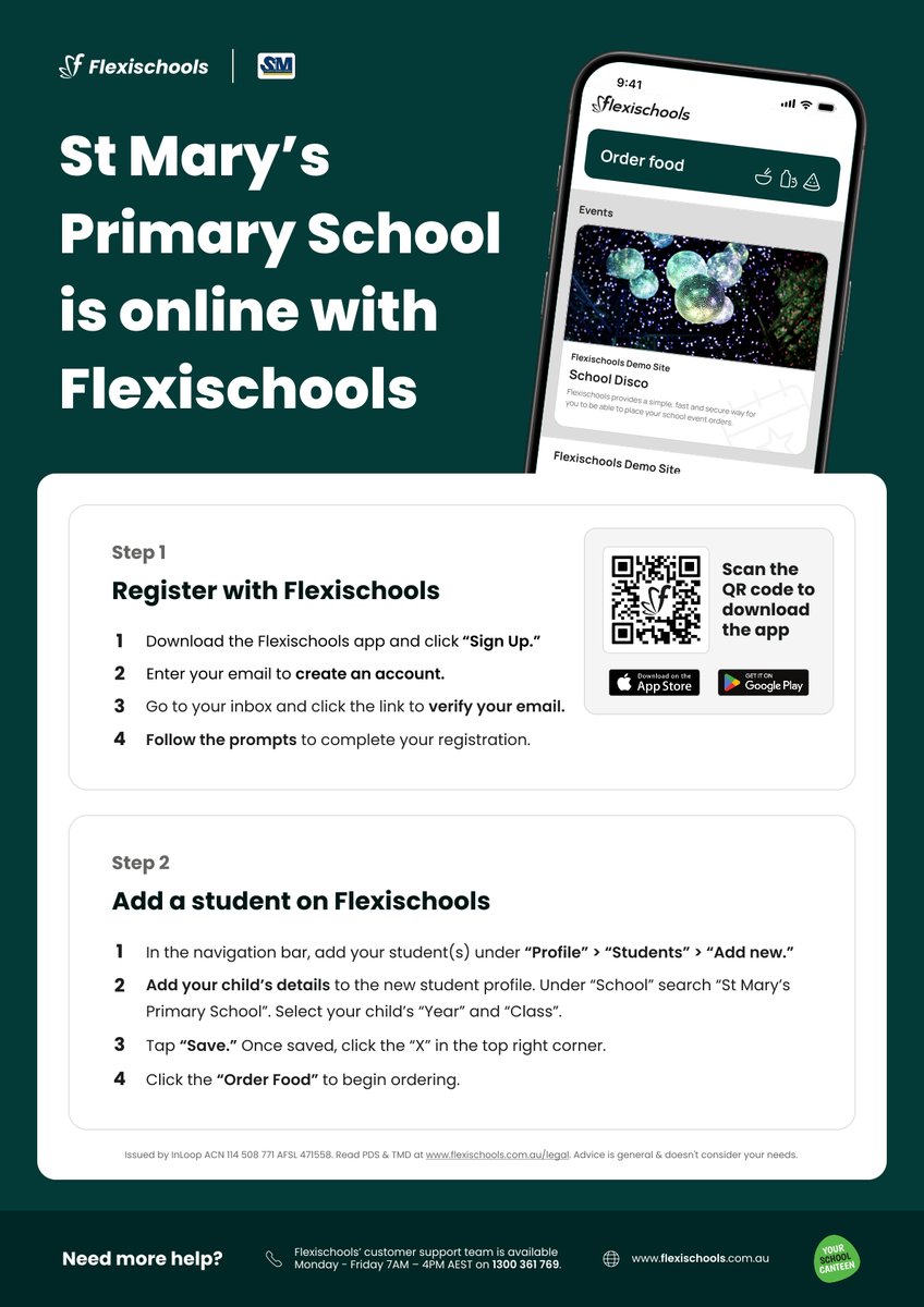 New ordering system for lunch orders commencing Term 4 'Flexischools Online Ordering System'. Lunch orders are available on Mondays and Thursday. Orders must be placed by 8:30am. If you require any assistance with getting started please do not hesitate to call 1300 116 637 or email siobhan@yourschoolcanteen.com.au.