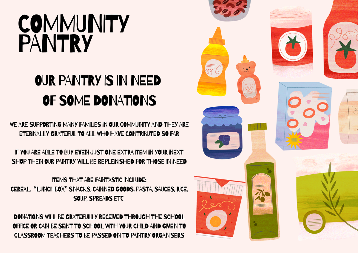We have been so fortunate to be able to support many families in need with our Community Pantry during this tricky financial time. The level of gratitude shown by families as well as the generosity of others has been heart warming and something I love about being a part of the Billanook Family. Please see attached flyer regarding a shout out for donations and donate only if you are comfortable and financially able. To those who are yet to reach out but need some support please don't hesitate to contact me so that we can ensure that food insecurity is eased in our community.