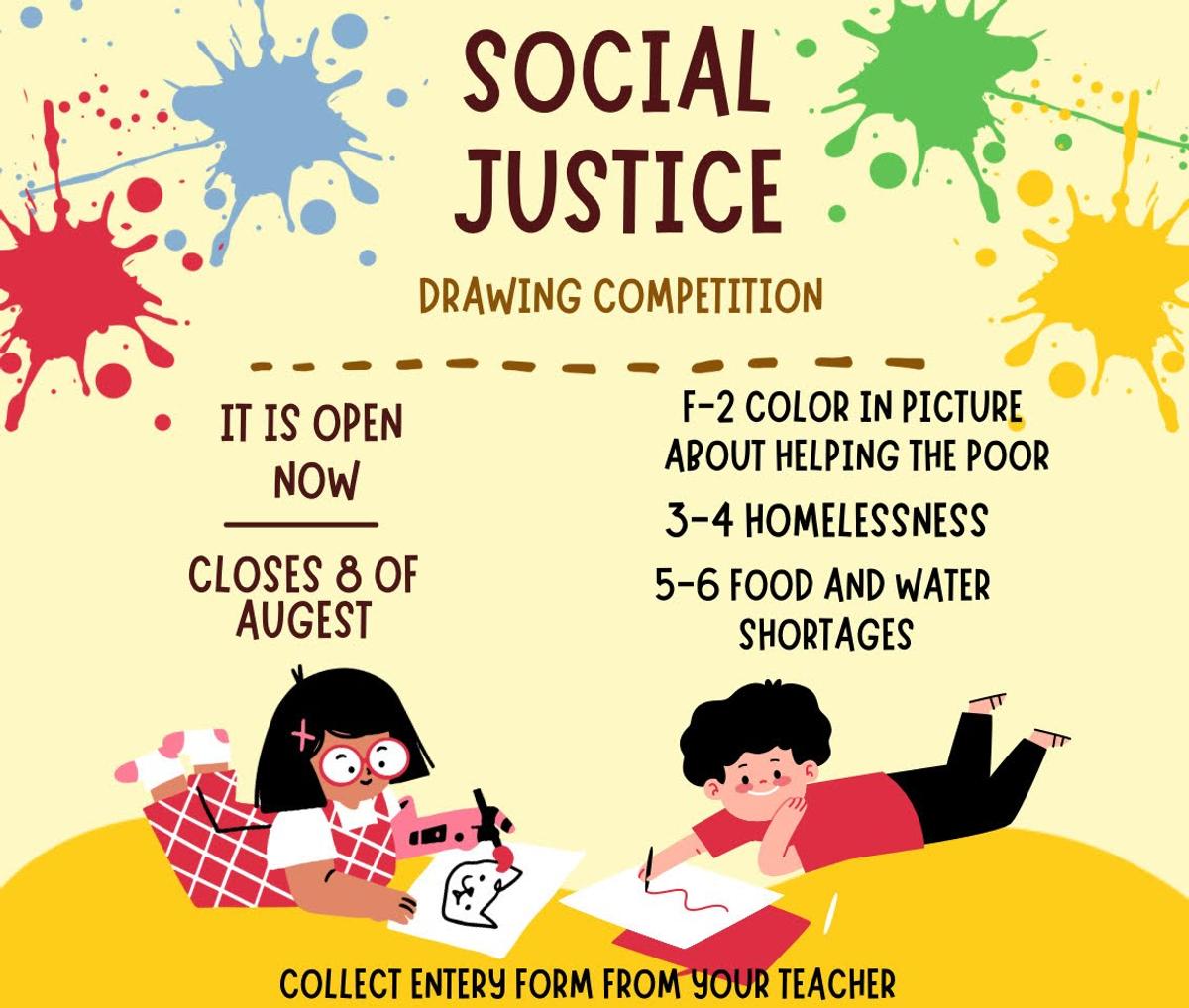 Recently the Year 6 Social Justice Team has been gathering ideas to fundraise and raise awareness about the problems happening around the world. Raising awareness has been our main focus this term and we have been brainstorming ideas that could help show our younger students the positive results of raising awareness about social justice issues. We have been pondering what to do and together we decided to make a drawing competition which is open now and closes on the 8th of August. There will be three age groups that will compete against people in the same group. There are prizes to be won that have been proudly donated to us from Collin’s bookstore. They will present the books to the winners of each year level groups with a certificate at the Week 6 assembly next term. Each winner would be fairly judged by the Year 6 Social Justice Team. The Social Justice Team has also been looking at different ideas and fundraisers for the future. We will keep you updated.