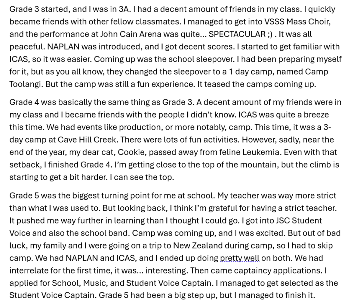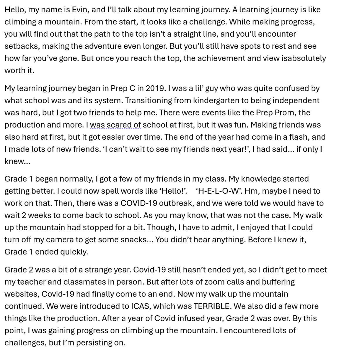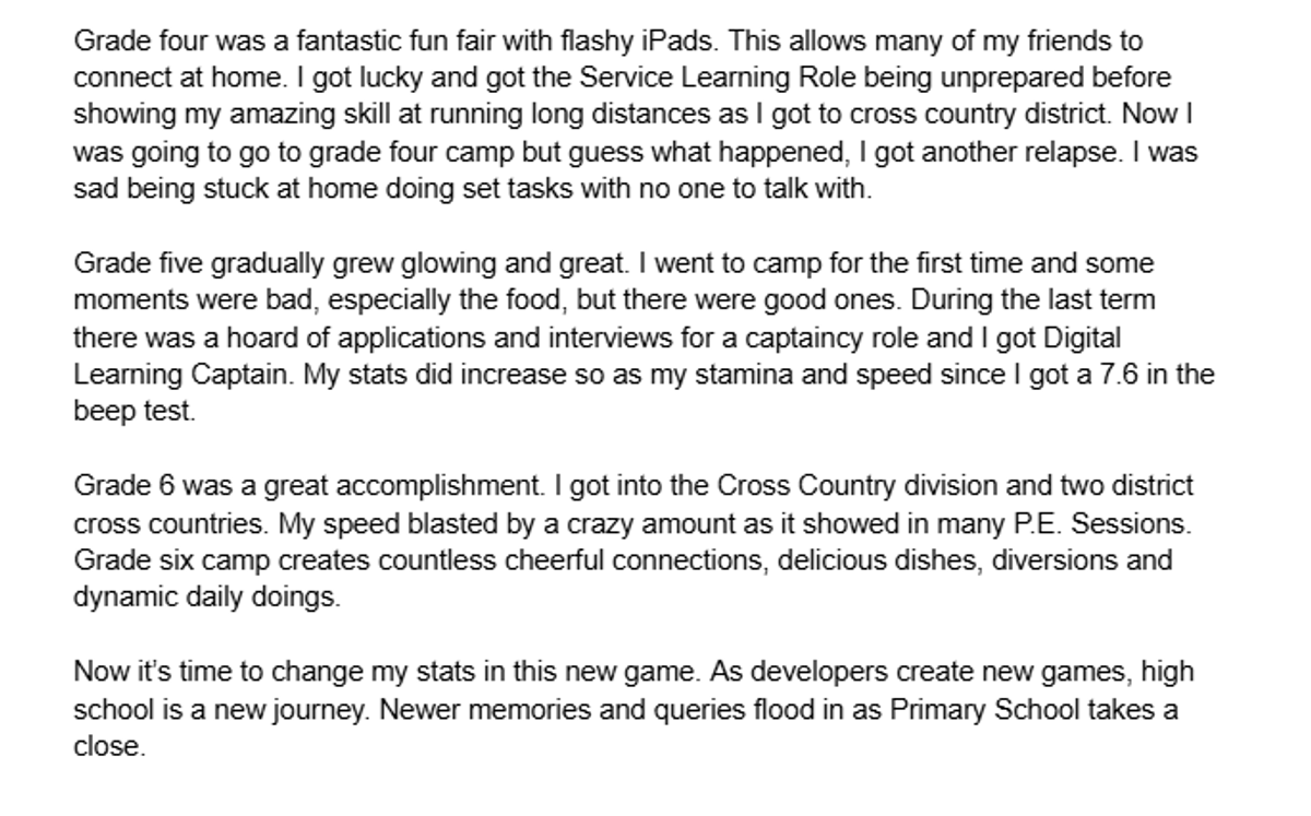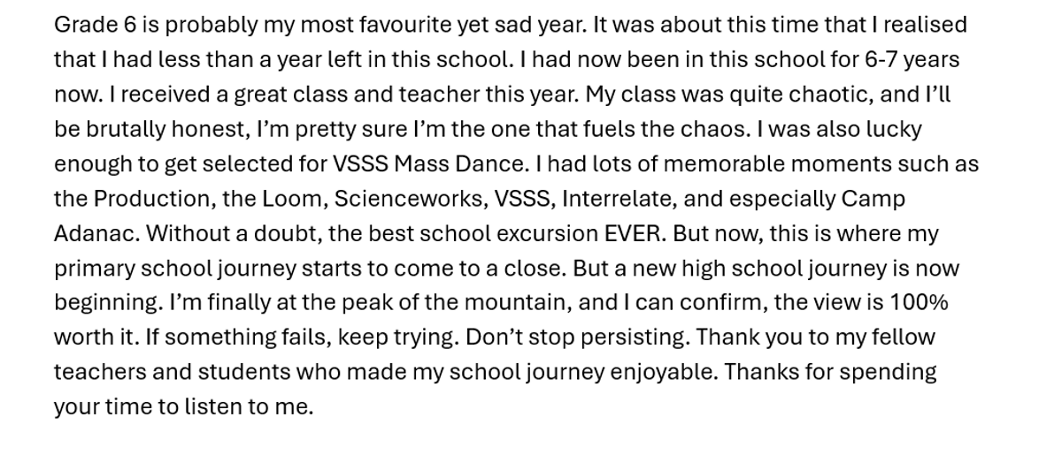 In 6E literacy, we have been working on our speeches for Graduation. In the speeches, we talk about our learning journey through primary school including GWPS. Everyone in the class created a speech and shared it with the class. After that, 8 people were shortlisted. We went through a voting period, and the finalists repeated one paragraph of their speech.