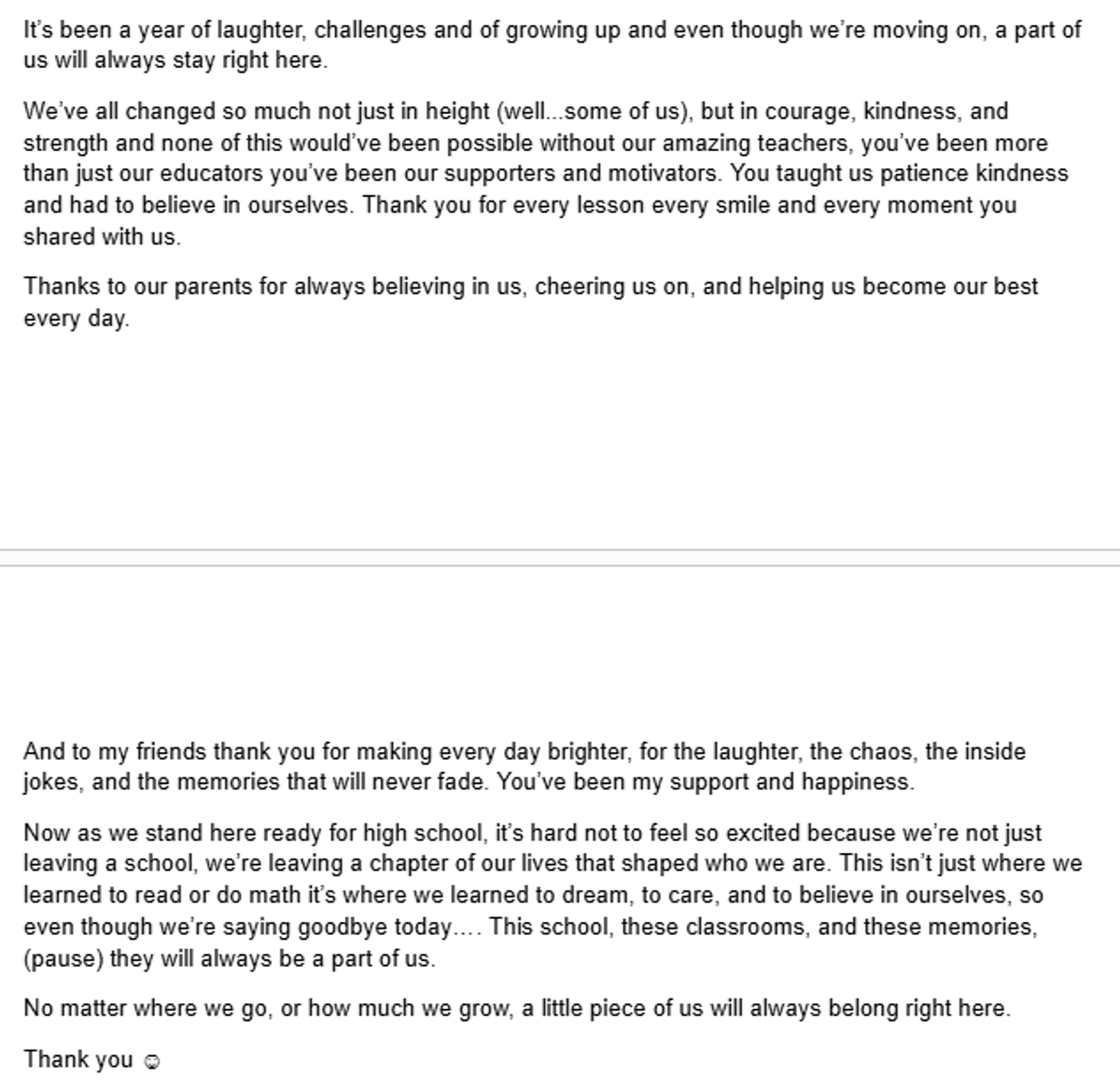 We voted on one person, Evin, to represent our class in front of the cohort. In the end, a student from 6A will be representing the cohort at our upcoming Graduation.