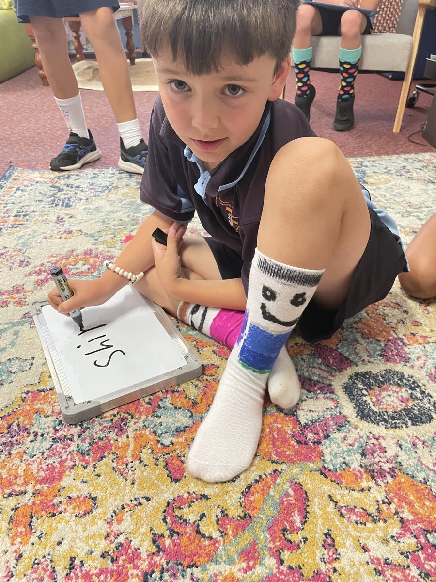 It was wonderful to see the children wear the socks they had decorated themselves or other 'crazy' socks and mismatched shoes from home. We enjoy showing them off at a 'fashion parade' in front of the other students.