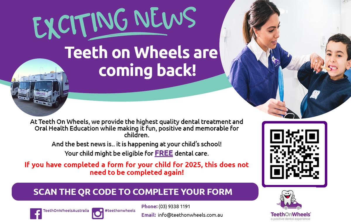 We’re pleased to welcome Teeth on Wheels back to our school! Starting on November 12th 2025, students will have access to regular six-monthly dental check-ups and fun, educational oral health sessions — all right here on school grounds.