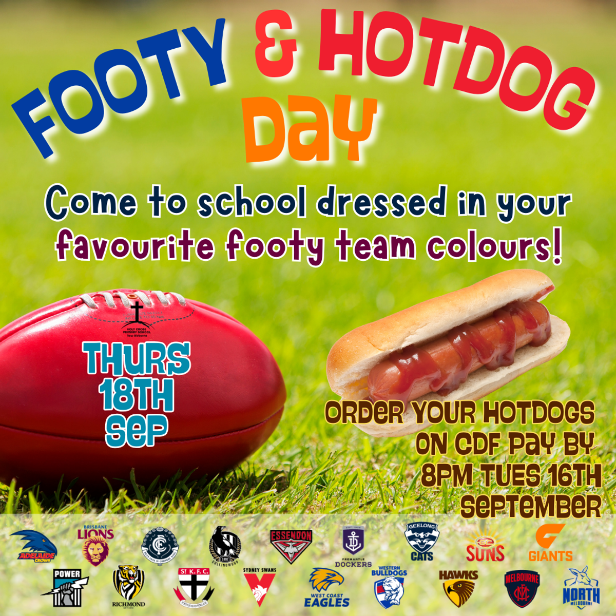A reminder that next Thursday 18th September, children are invited to come to school dressed in their footy colours. Hot Dogs are available for lunch - please order through CDF Pay before Tuesday 16th at 8.00pm.