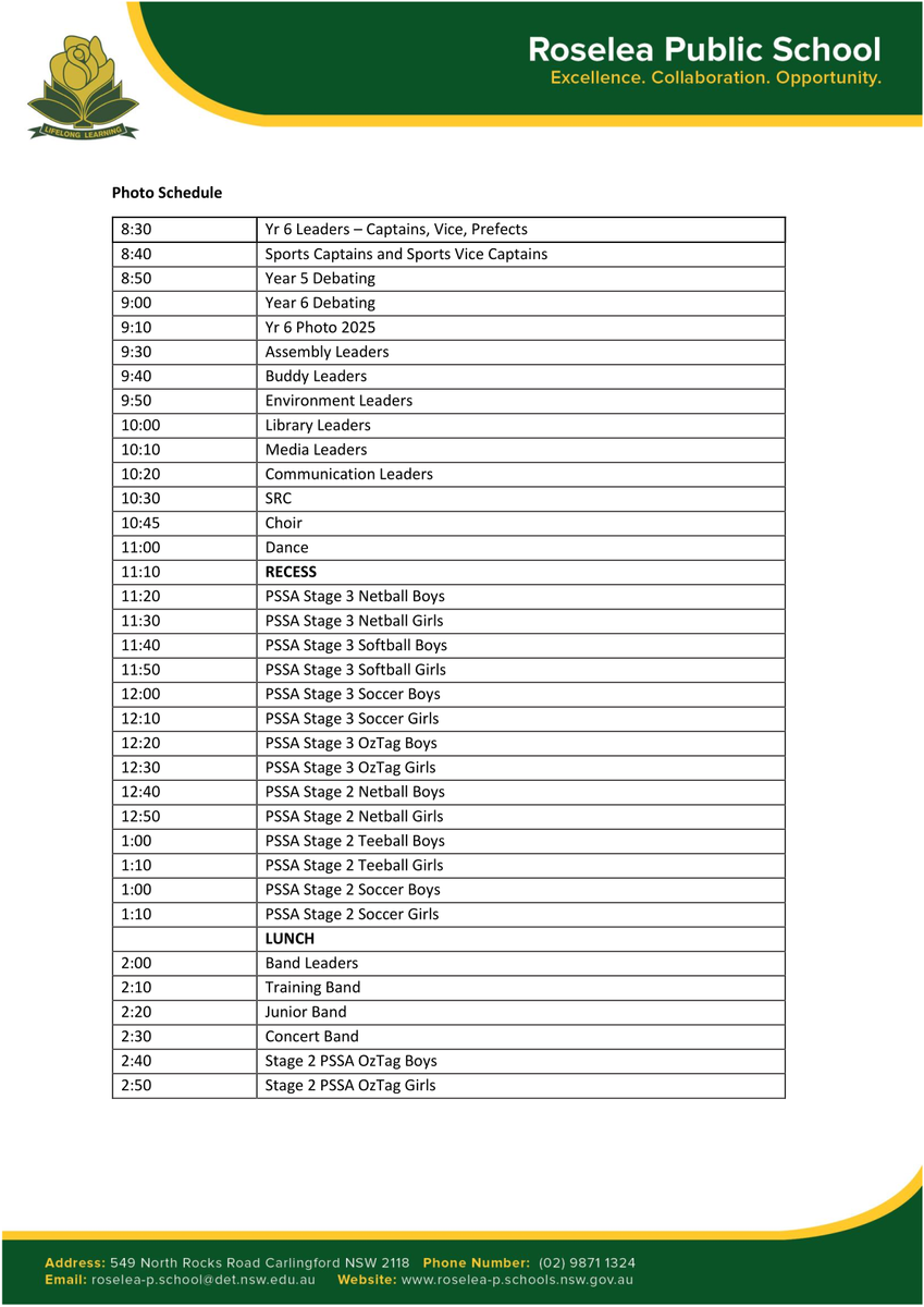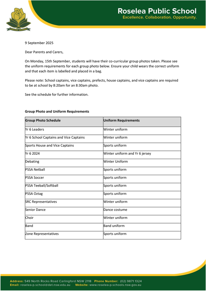 The co-curricular group photos will be taken at Roselea on Monday 15 September. Please refer to the document below which details the uniform requirements for each group.