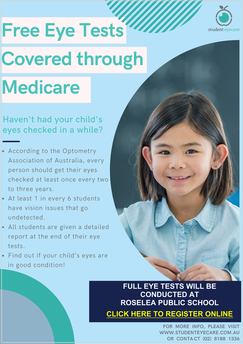 Roselea Public School is pleased to announce that the Student Eyecare Program will be running in Term 4, 2024. An optometrist will be onsite during school hours to provide students with a free comprehensive eye examination that is covered through Medicare Australia.