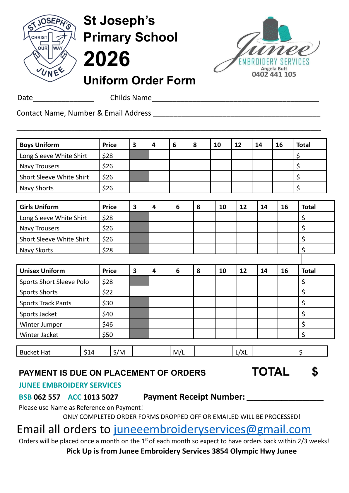 Orders will only be placed with payment and above form completed and either emailed or dropped into Junee Embroidery Services. Please ensure you write your payment receipt number on your form and leave your name as the transfer reference. This will ensure a smooth ordering process.