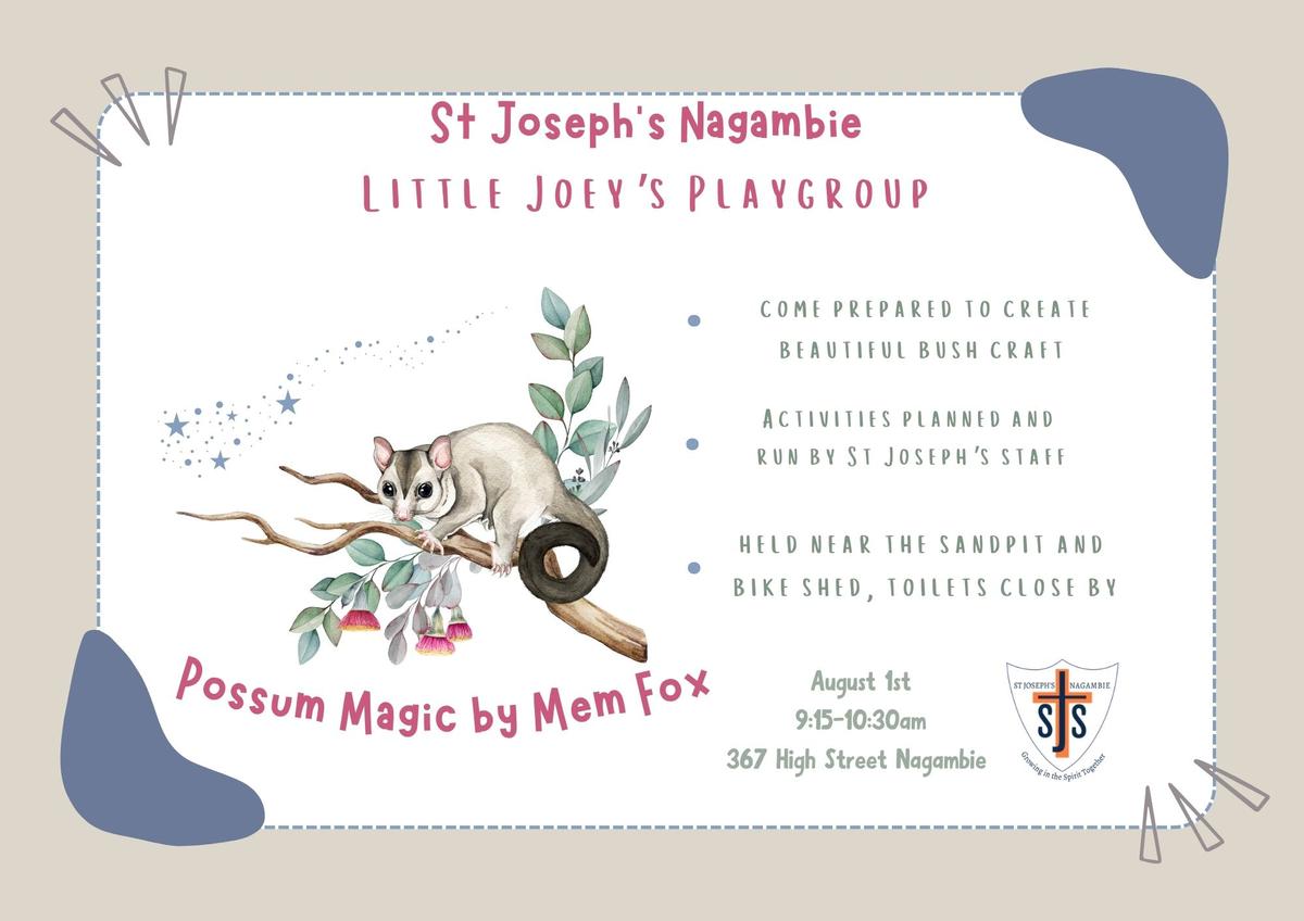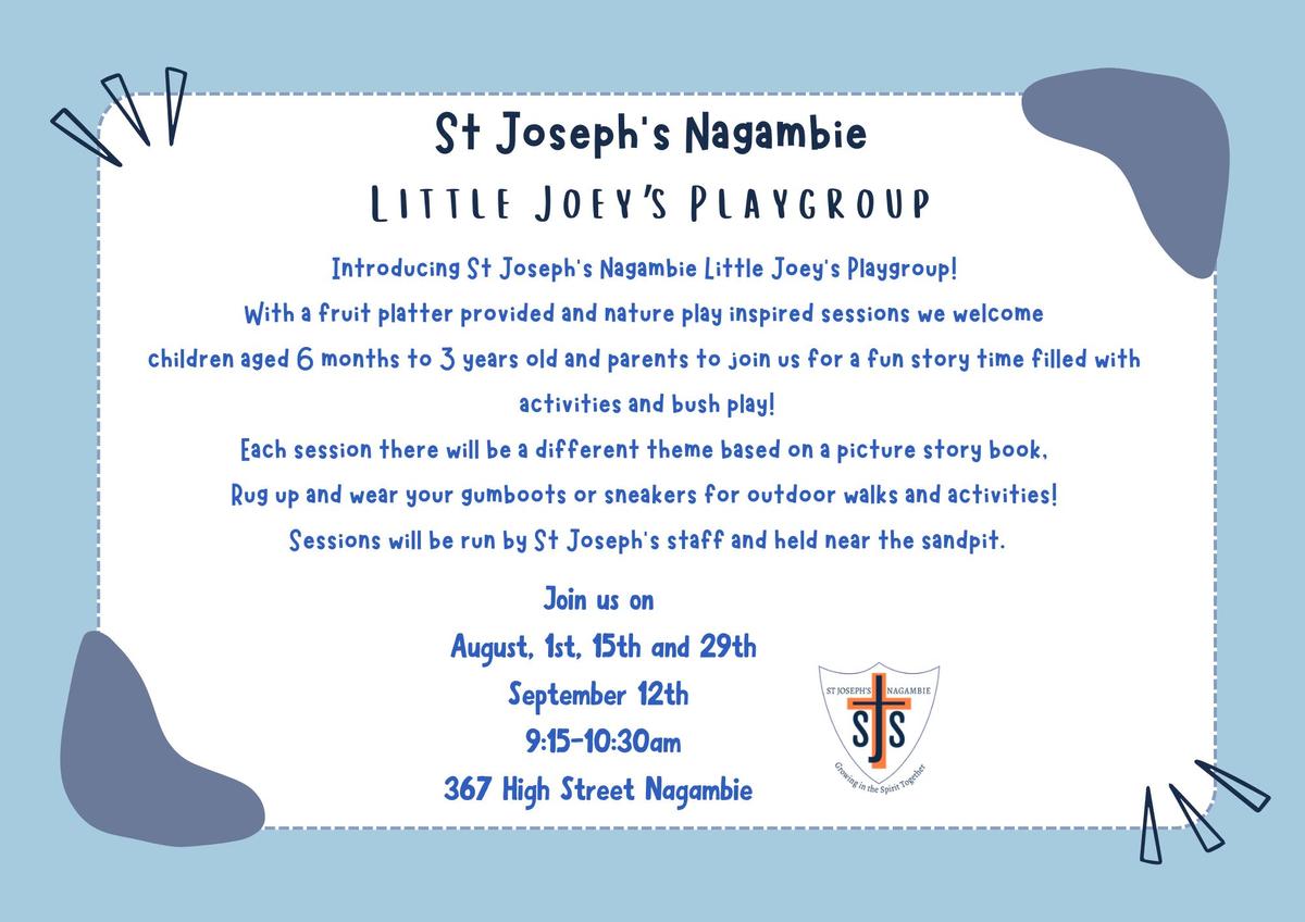 We are very excited that Little Joey's Outdoor Playgroup will start next week on Thursday 1st August. This will be an opportunity for families to bring their little ones (6 months -3 years) to hear a story, participate in activities and have some time to connect with others. Please share this exciting venture with anyone age appropriate.