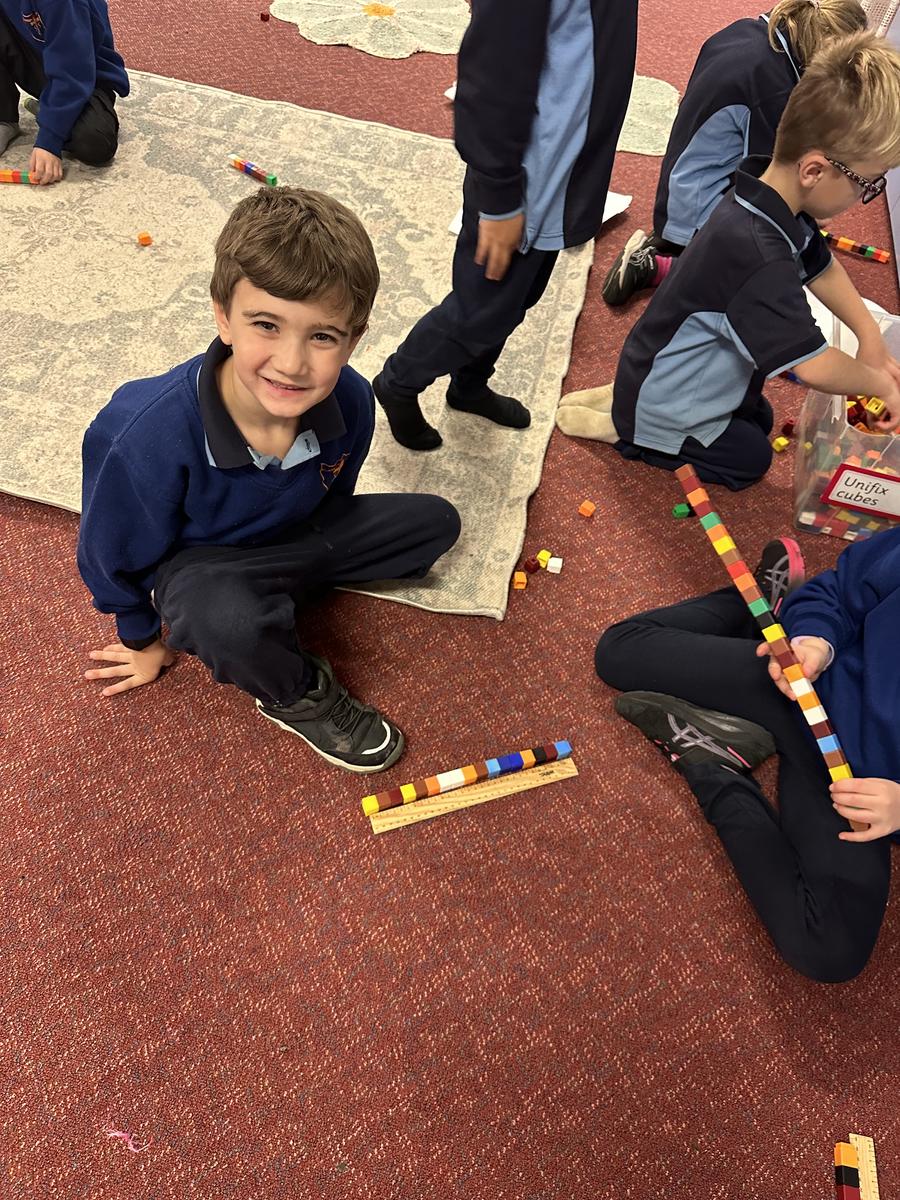 This fortnight, we continued developing our understanding of measurement concepts, focusing on shape and length. Students quickly made connections between length and their everyday experiences, using familiar examples to help deepen their understanding. Together, we brainstormed language associated with length and used informal units, like blocks, to compare and measure various objects around the classroom.
