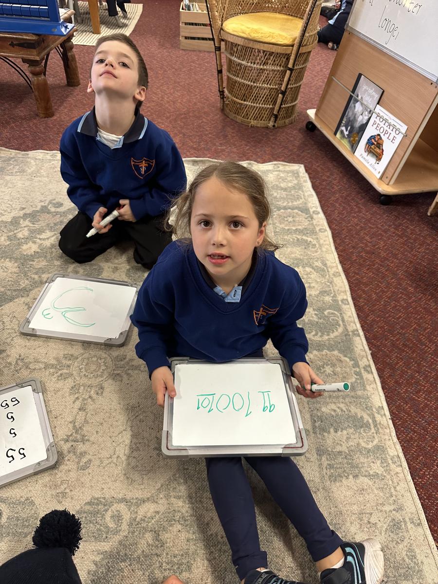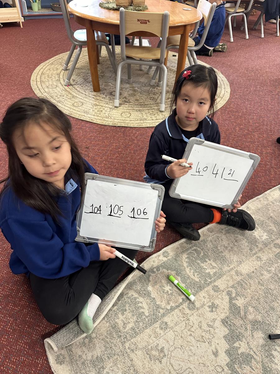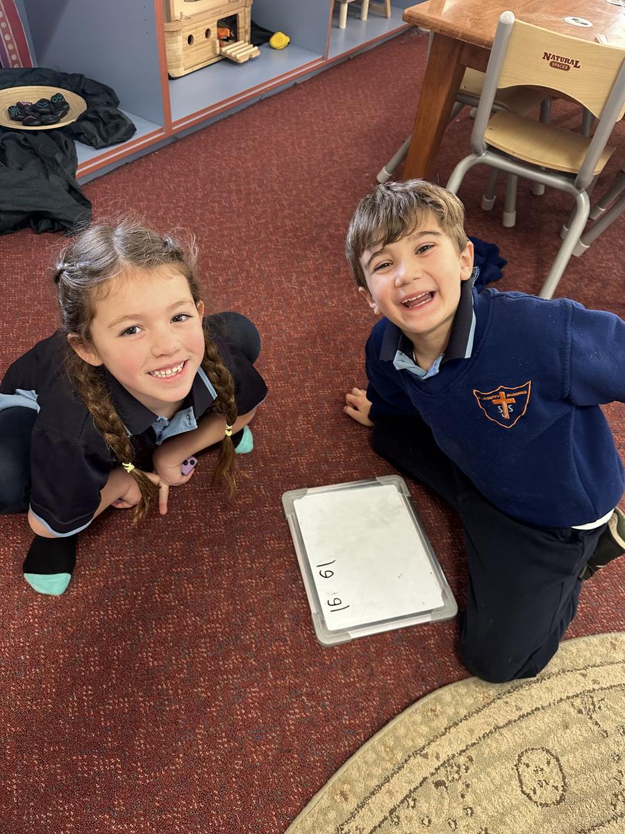 We also continue working on counting skills, with a strong focus on counting backwards. Through number games, students are strengthening their ability to quickly recall the numbers that come before and after. Students have also been working on writing two-digit numbers.