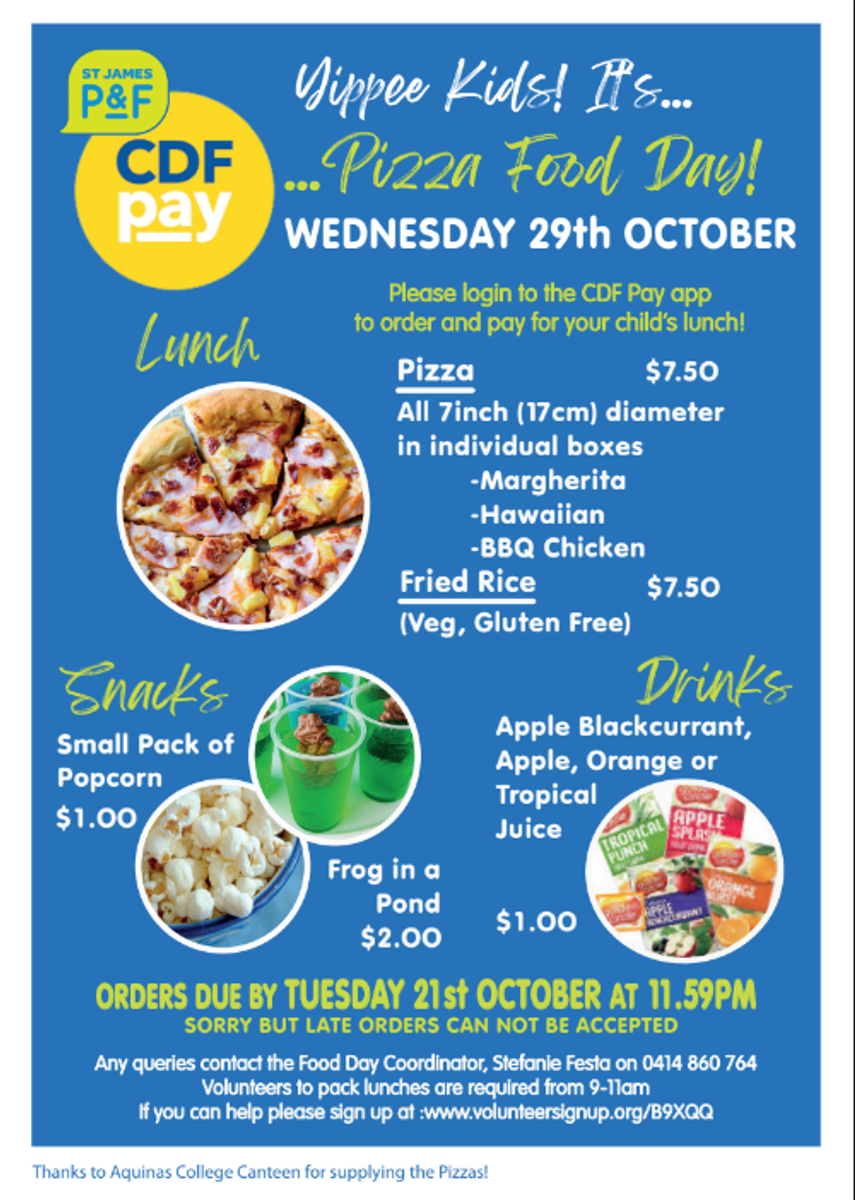 Wednesday 29th October will be Pizza Day. Bookings close tomorrow so get your orders in ASAP!!!