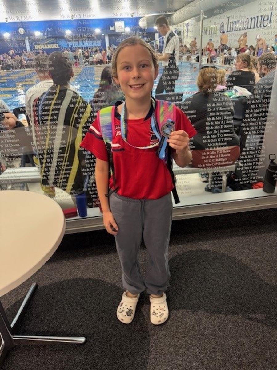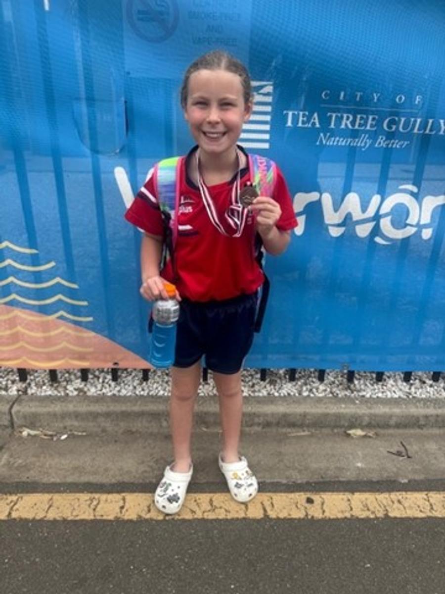 Well done to Evie H (5 Gold) who competed at the Immanuel Short Course Swimming Carnival last weekend while representing Norwood Swimming Club. Evie competed in four events, gaining Personal Bests in three of the four events. She also managed to win her first medal representing the club, coming 2nd in the 100m breaststroke. After finishing in 4th place at the last race meet, Evie was over the moon to snare a medal and a new PB!