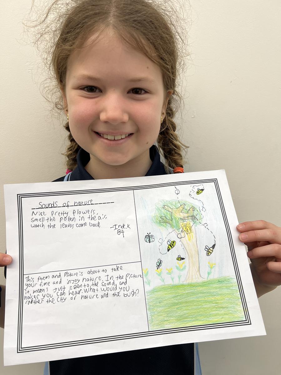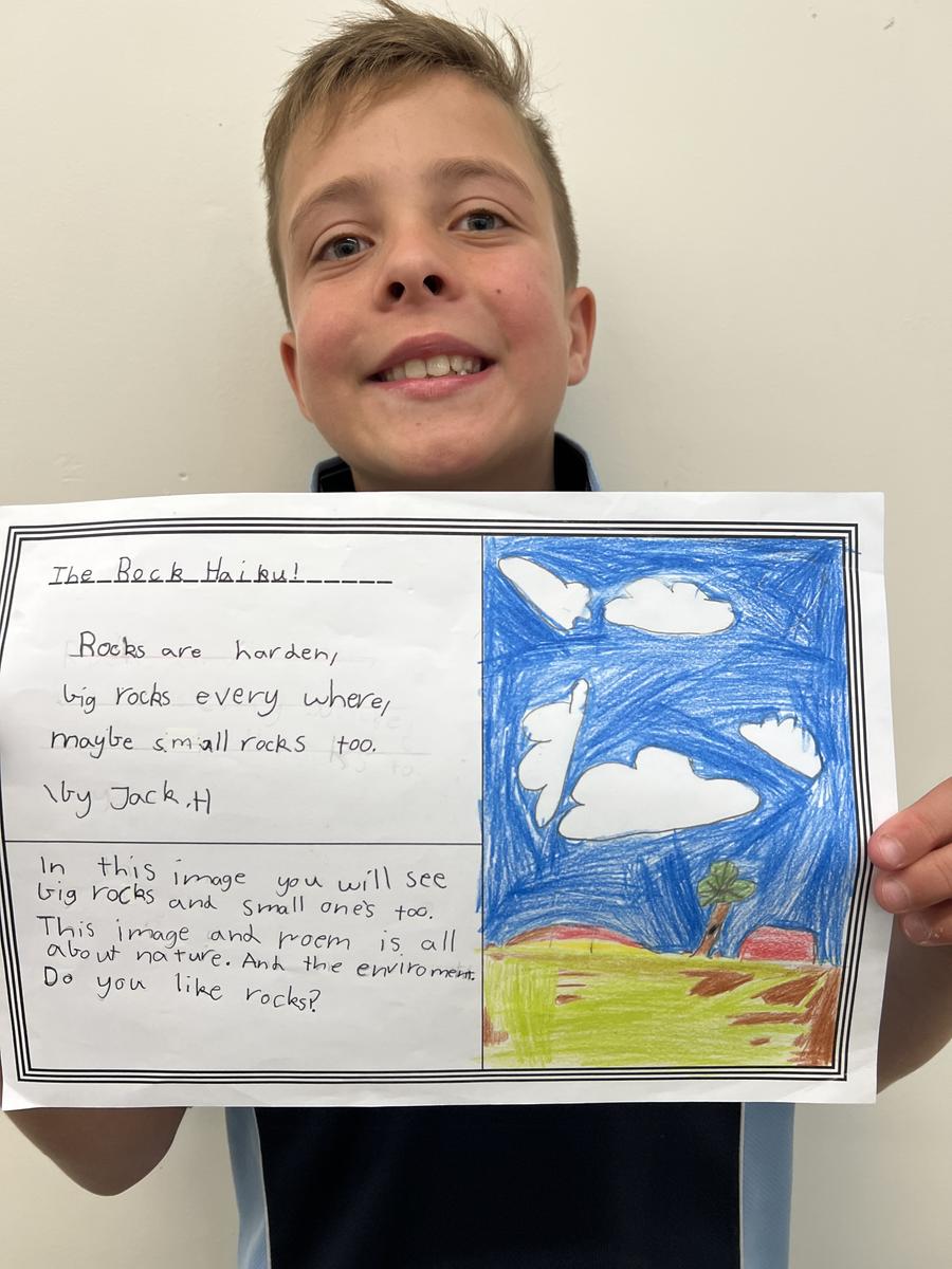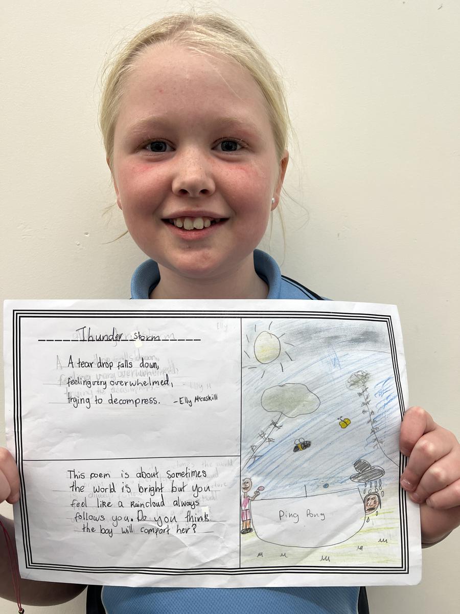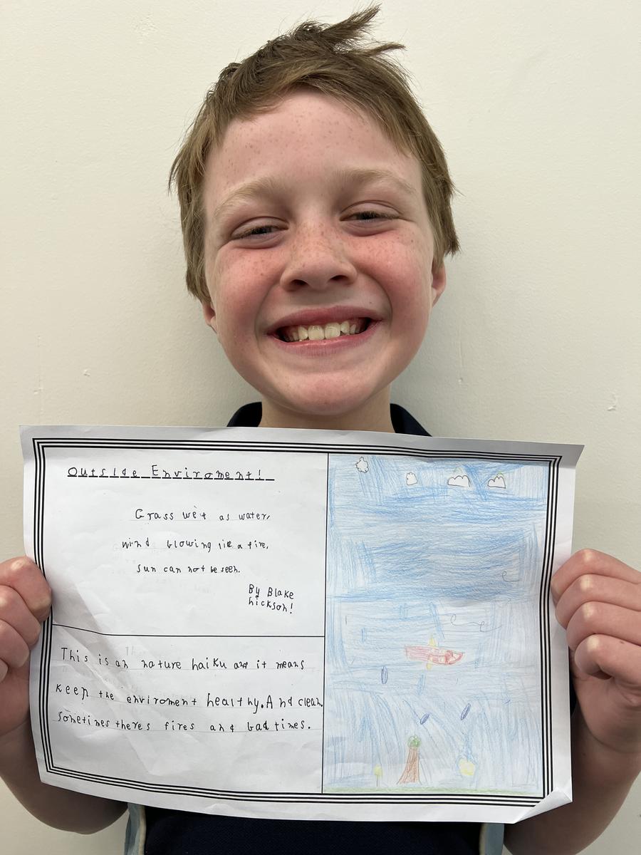 Over the past two weeks, the students in B4 and the 3/4 cohort, have been learning about haiku poems. They have shown great engagement, especially having the opportunity to sit outside when writing. They have used nature, weather and even the time of day to inspire their haiku writing. Students have also had great fun following the rules of a haiku, ensuring it follows the syllable pattern of 5-7-5. After writing many, they have published their favourite haiku. Please find some examples from B4 below: