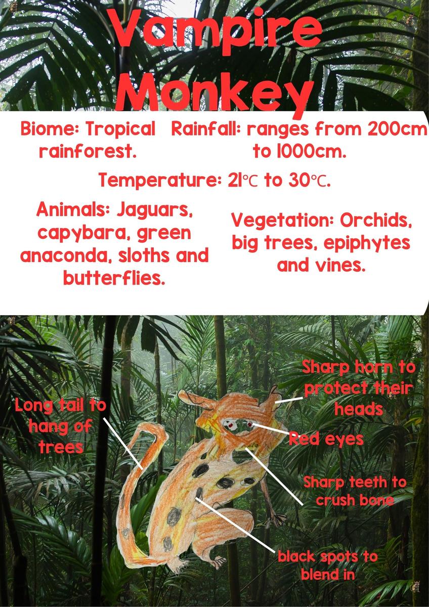 Students have been learning about the way animals adapt to survive in their environment. We have looked at the 3 types of adaptations: structural, behavioural and physiological. Students have chosen an animal to research and have written an information report on their animal. This included the habitat they live in, their appearance, their diet and their adaptations. They are now creating their own animal. They have to decide on the biome (habitat) they live in, and the adaptations their animal has to help them survive in this environment. We have been creating posters on our creations.