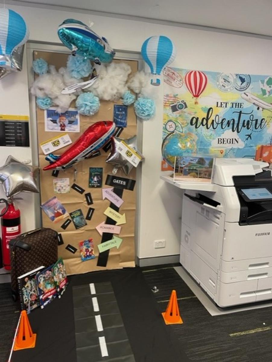 To fully embrace the theme, our office staff dressed up as cabin crew, complete with uniforms and accessories, to create an authentic airline experience. Our office was transformed with an airline theme, decorated with posters, luggage, and travel-inspired displays that made it feel like a boarding gate for a great reading journey.
