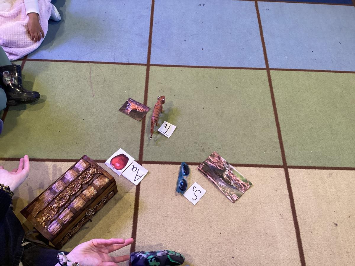 Throughout the weeks, our Forest Room Letter Box has grown and been modified. Items beginning with the focus letters started to be inside it (Tiger, Sunglasses), along with images and then movement cards! Implementing movement into the children's learning caters for individual learning styles while continuing to build brain and body connections, which are crucial for concentration, listening, and retaining information.