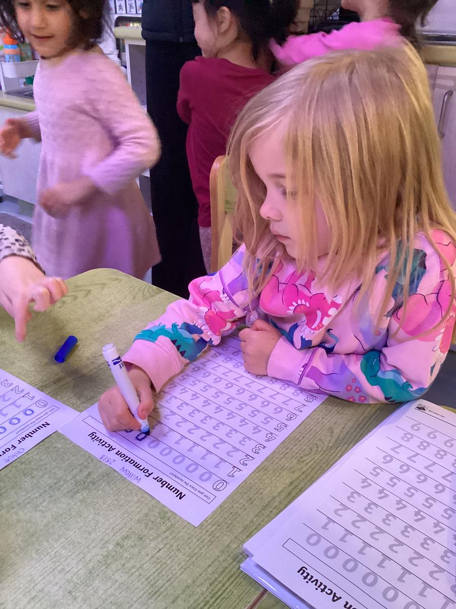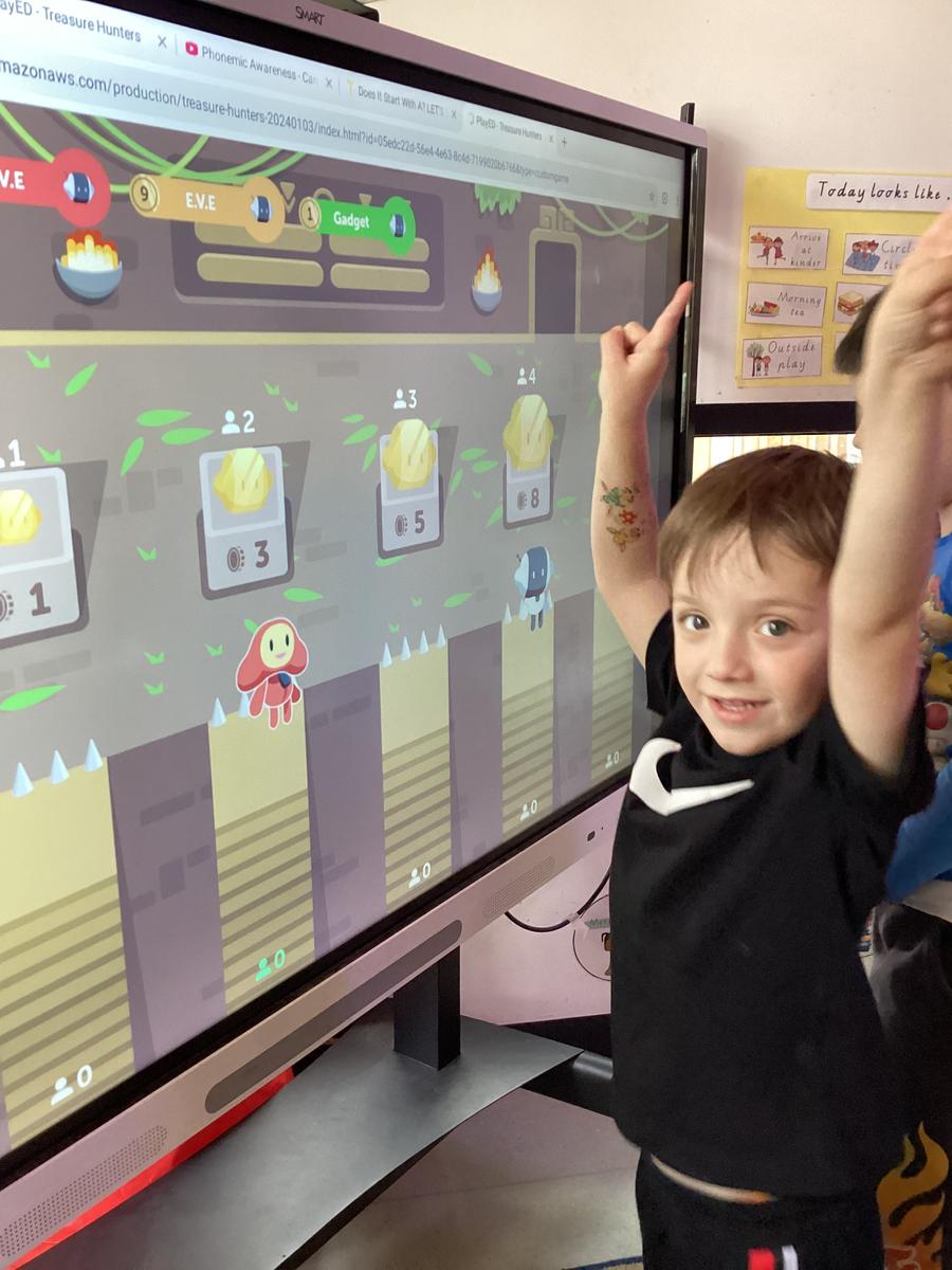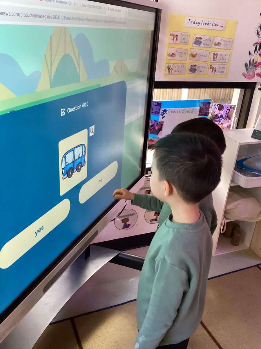 We strengthened our numeracy skills by counting up to 20, whilst also exploring some higher numbers due to the children’s interests. We read the book ‘Ten apples up on top” by Dr Seuss, on our interactive whiteboard. Our interactive whiteboard provides the 4-year-olds with a variety of tools that supports them in their learning, our favourites to do on the interactive whiteboard are: writing/practicing numbers, watching numberblocks, engaging in top teacher digi-games that explore many mathematical topics including measurement, weight, adding, subtracting, bigger or smaller.