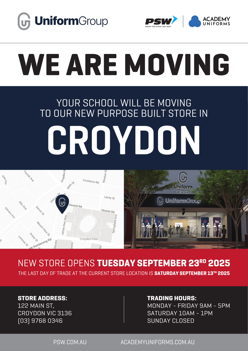 We are relocating to an amazing new store in a great location not far from our current premises. Please see attached a flyer to circulate to your families with store details.